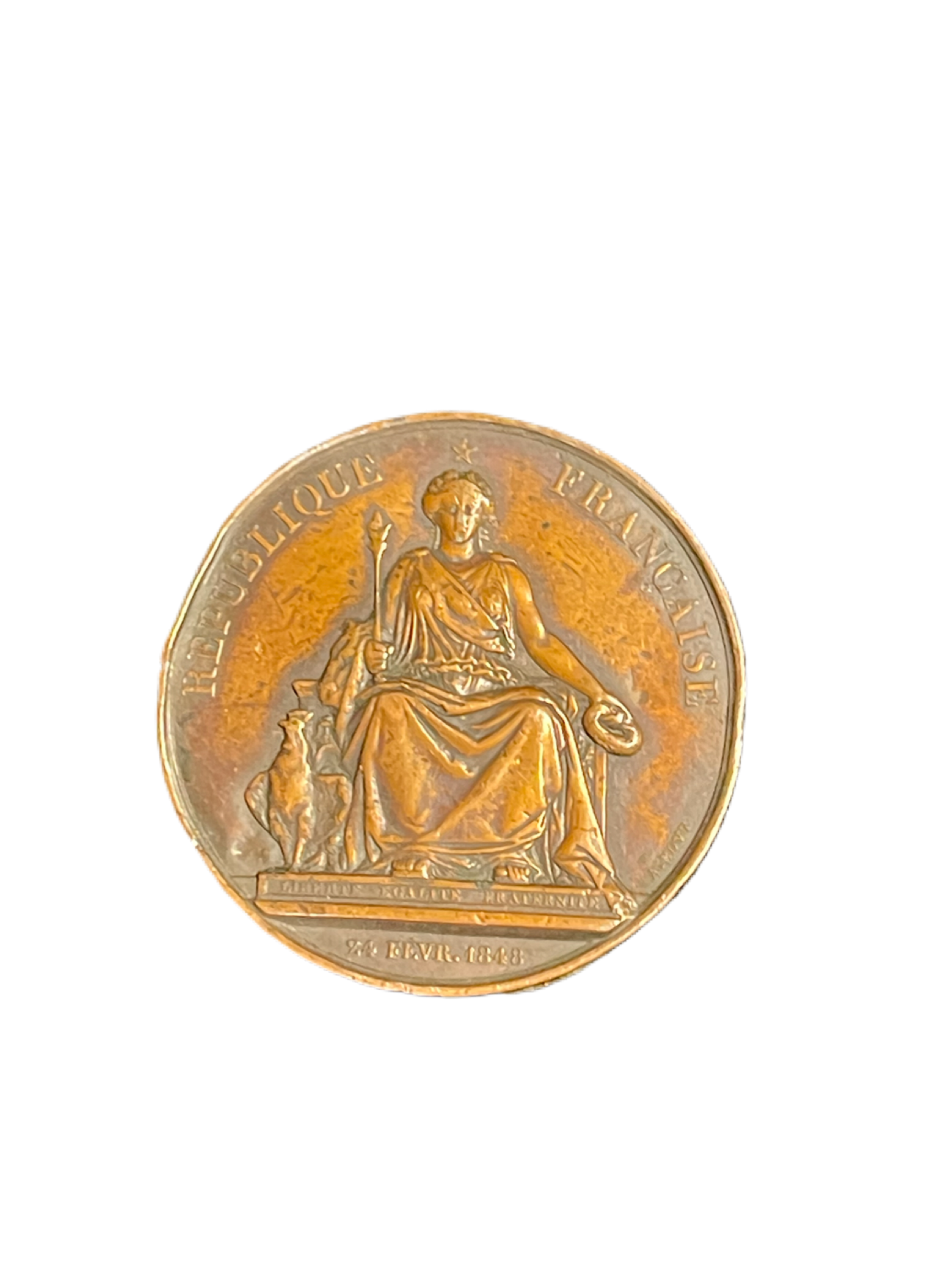 For sale is a rare and historically significant 1848 French Agriculture and Manufacturing Award Medal, designed by the renowned engraver Antoine Bovy. This 56.9mm bronze medal hails from the Second French Republic, a transformative period following the 1848 February Revolution. The obverse features an allegorical depiction of Marianne, the personification of the French Republic, seated with a staff and wreath, symbolizing authority and honor. A rooster, a national emblem of France, stands at her side, emphasizing patriotic pride. The inscription “RÉPUBLIQUE FRANÇAISE” encircles the design, with “A. BOVY 1848” at the base, marking the artist and year of issue. The reverse is plain, typical of award medals intended for personalized engravings.