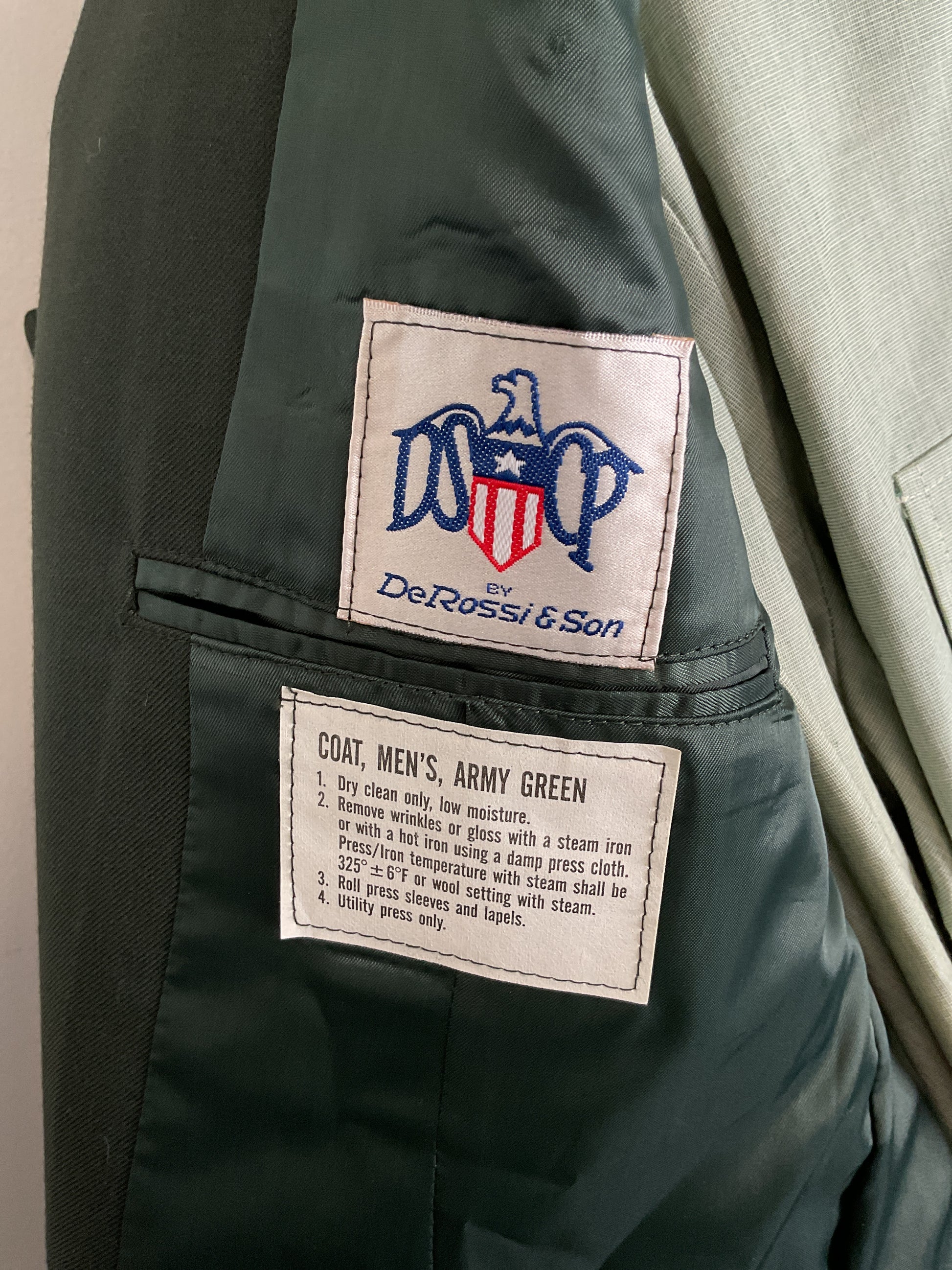 For sale is an authentic post-WWII U.S. Army Dress Green Uniform set, consisting of an Army Green Service Uniform (AGSU) jacket and matching dress shirt, belonging to a Staff Sergeant in the 3rd Infantry Division. This dark green polyester-wool jacket features the 3rd Infantry Division patch on the right shoulder—a red keystone—along with Infantry branch insignia (crossed rifles) on the collar. The sleeves display three chevrons with two rockers, indicating the rank of Staff Sergeant, likely from the 1950s to 1970s, a period when the division served in the Korean War and later in Germany during the Cold War. The interior label from DeRossi & Son adds provenance to this piece.