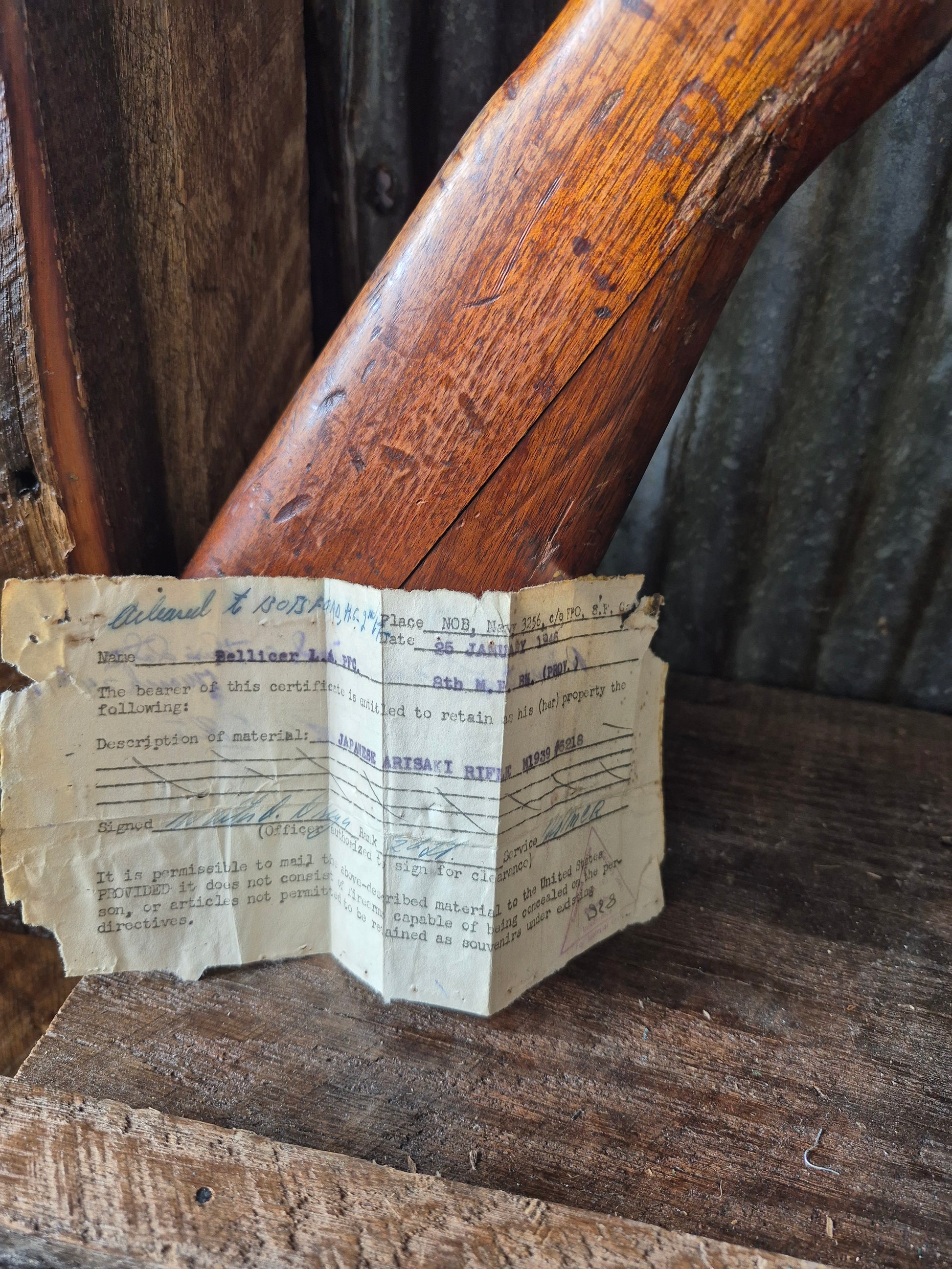 Original type 99 7.7 Arisaki USGI bring back with bring back paperwork! Missing the cleaning rod and the MUM has been taken off.