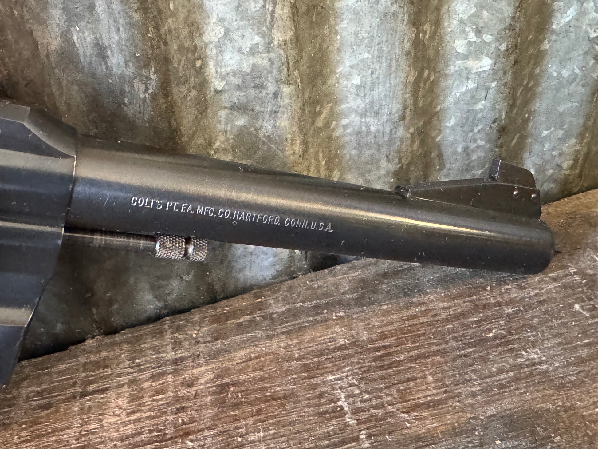 This model features Colt’s high-polish Royal Blue finish, a 6-inch heavy barrel marked “Officers Model Match .38 Special”, adjustable rear sight, and finely checkered walnut target grips with inset Colt medallions. The revolver remains in excellent condition, showing minimal handling wear and retaining crisp case colors on the hammer and trigger.