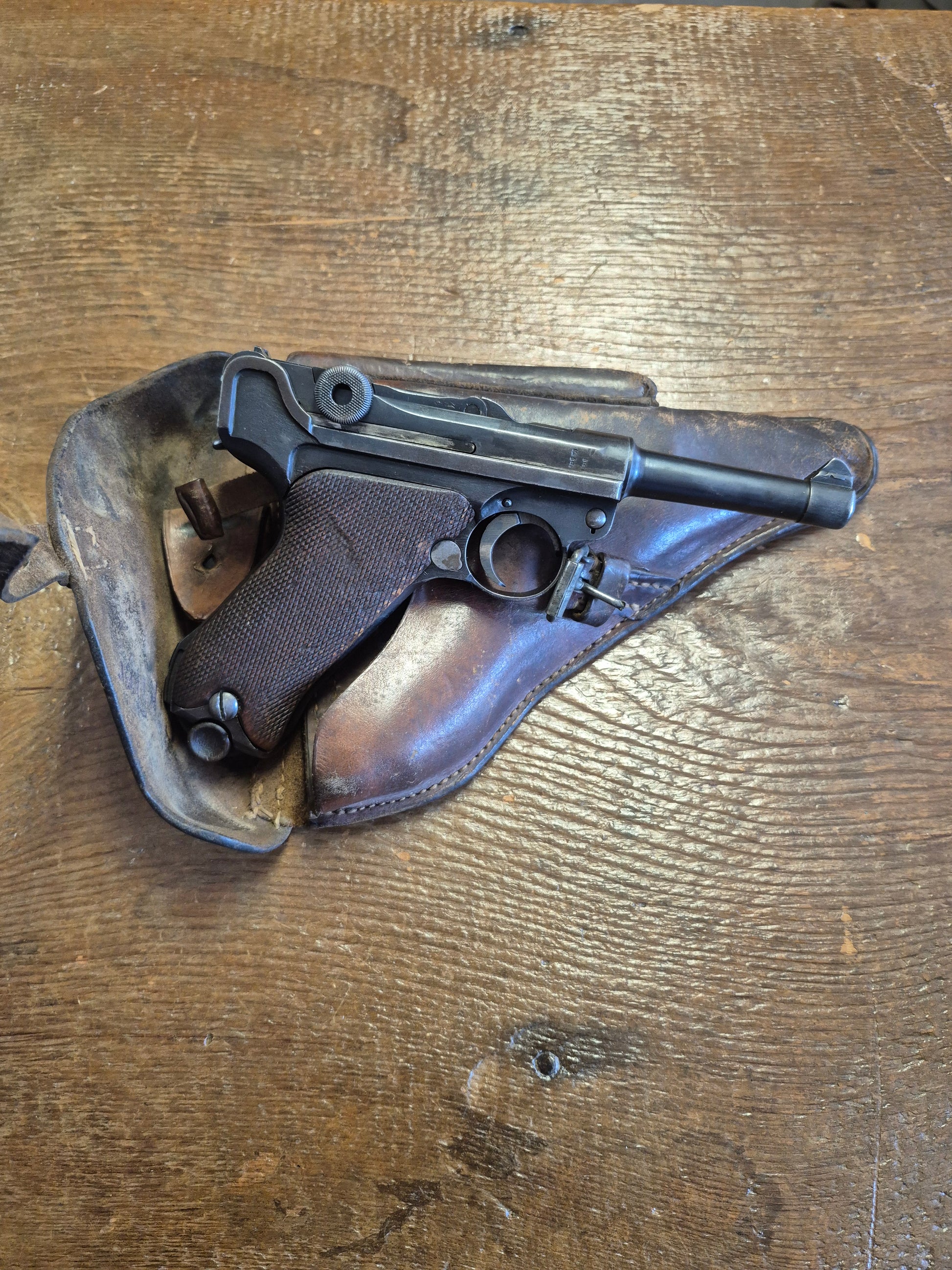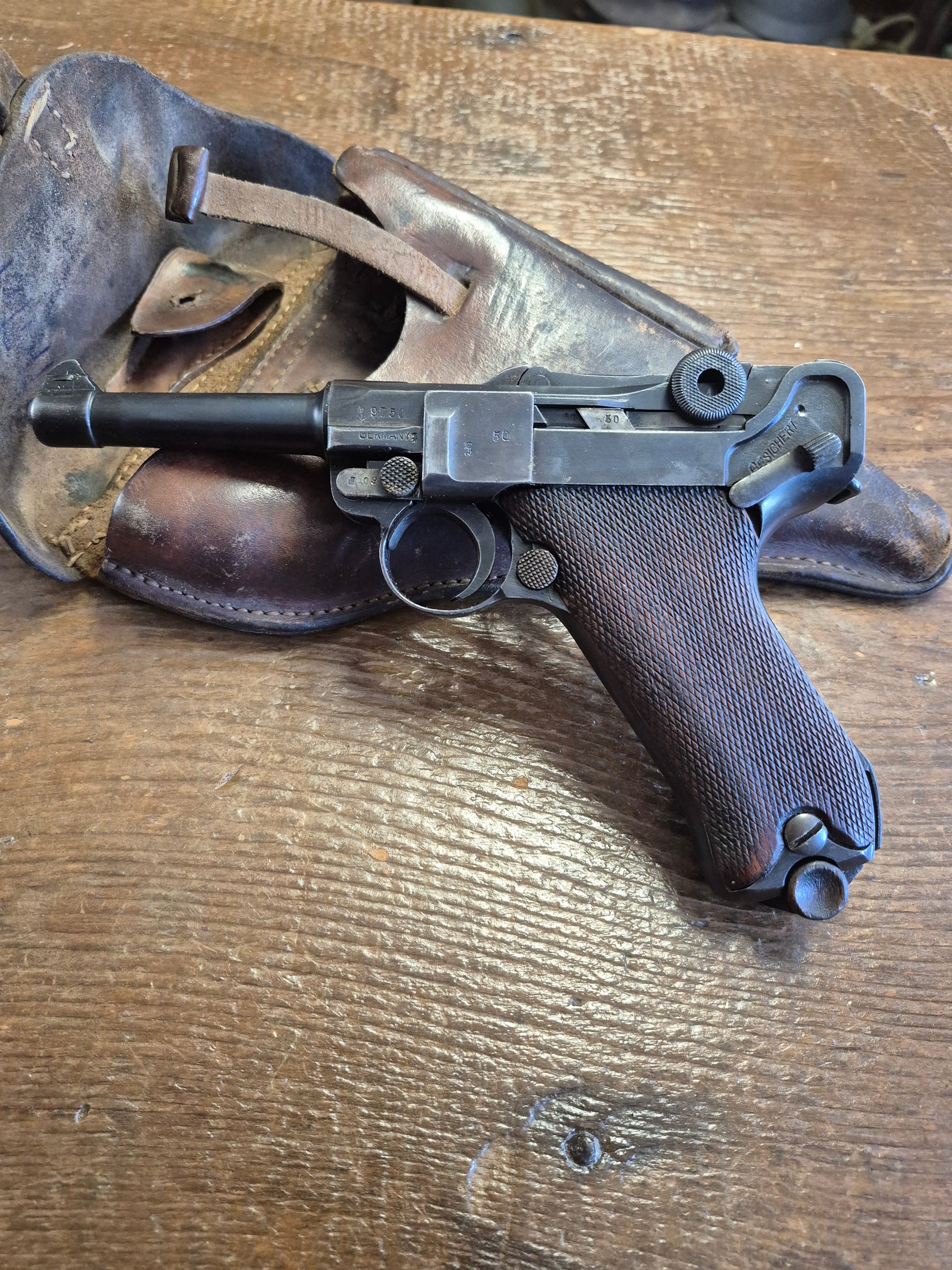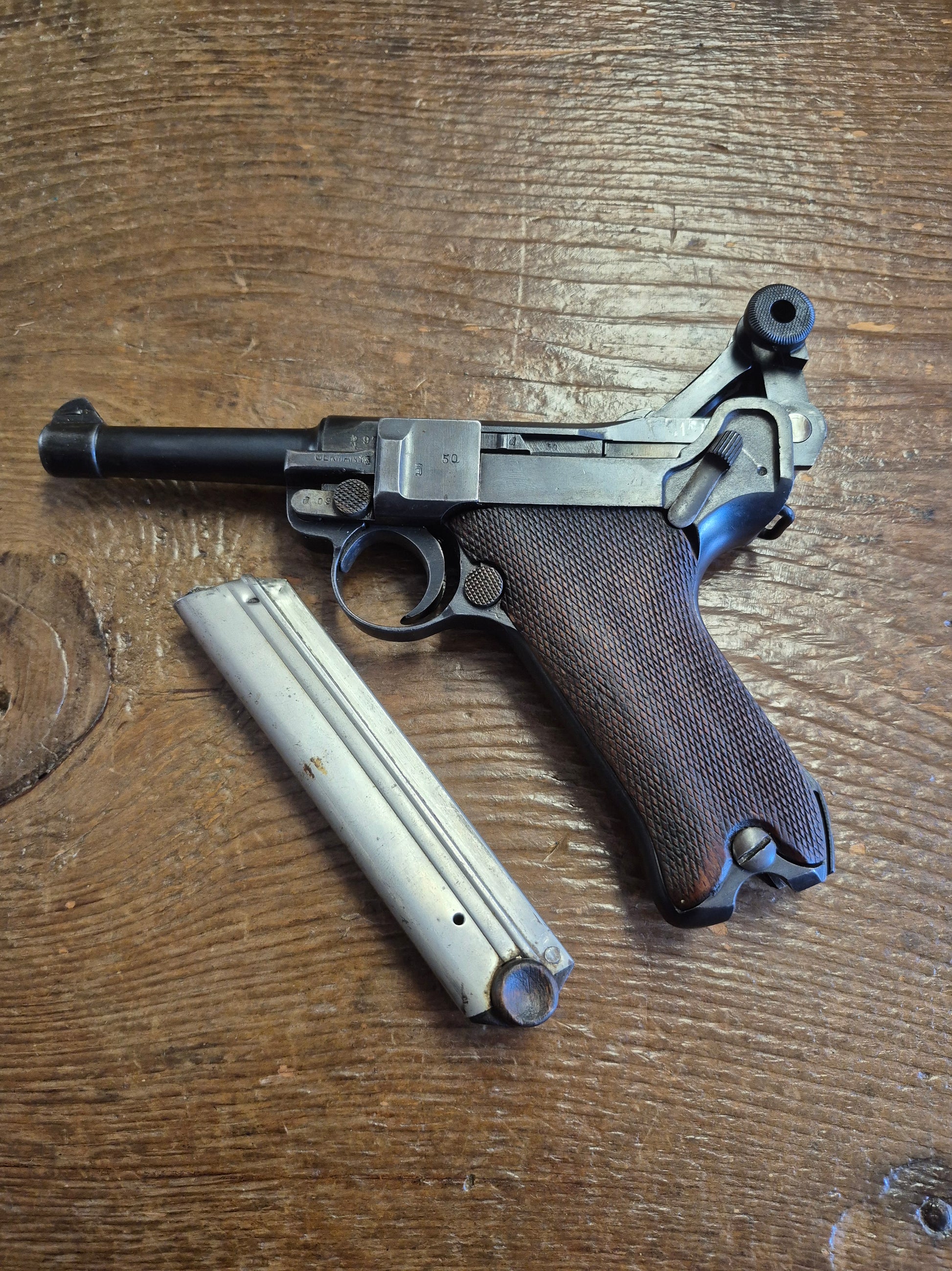 Excellent condition Erfurt P-08 7.65x21 German Luger. Believed to be a police rework pistol. There is no date stamp or makers emblem present. The barrel and the takedown lever are not the same # as the rest of the gun. The magazine is number matching to the receiver.