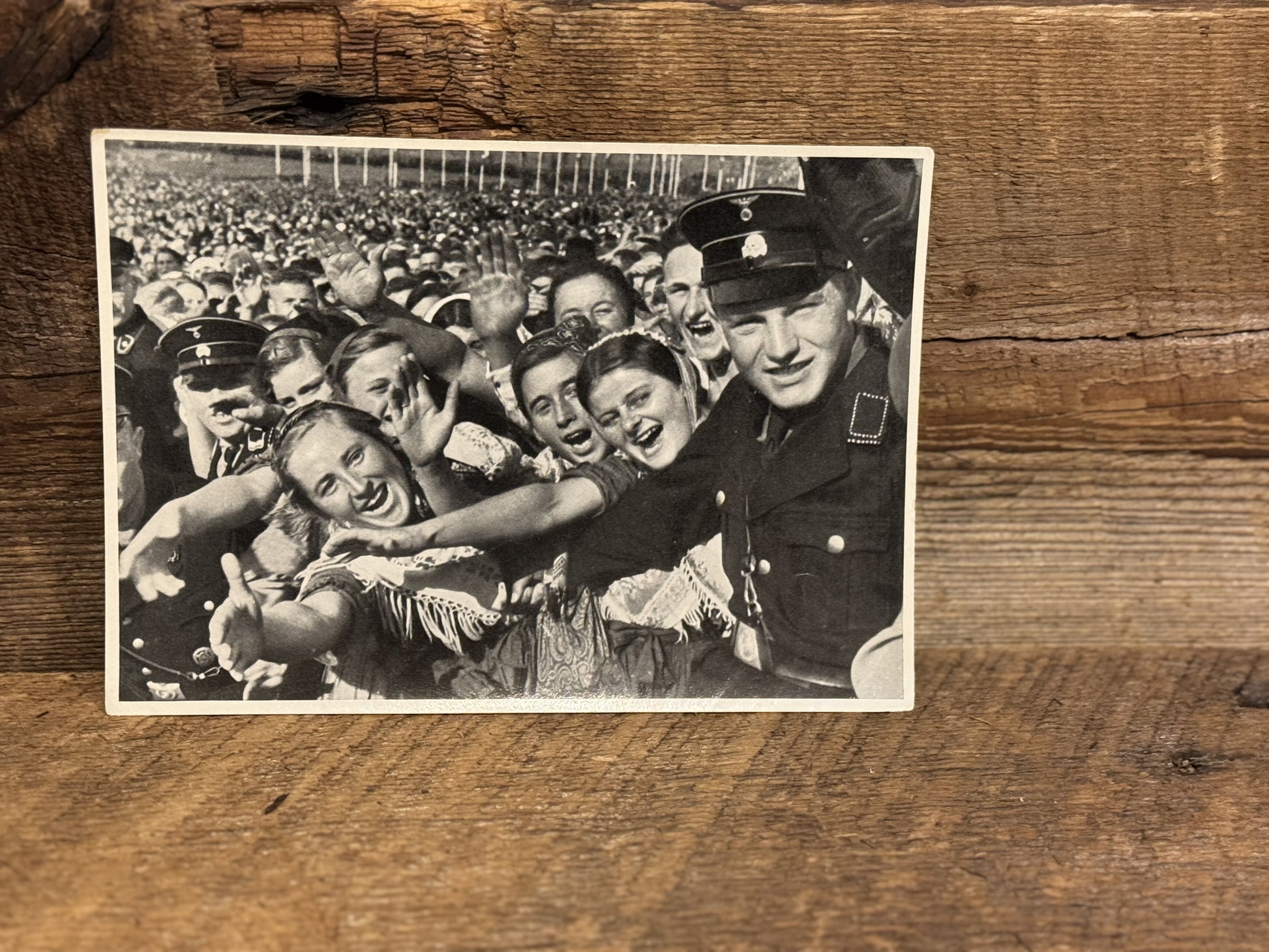 Step back in time with this captivating WWII-era German tobacco propaganda card, showcasing a vibrant scene of a passionate German crowd. This unique piece of history not only reflects the era's cultural sentiments but also serves as a striking collectible for enthusiasts of wartime memorabilia. Perfect for display or as a conversation starter, this card offers a glimpse into the past and the powerful influence of propaganda during one of history's most tumultuous periods. Don't miss the chance to own this intriguing artifact!