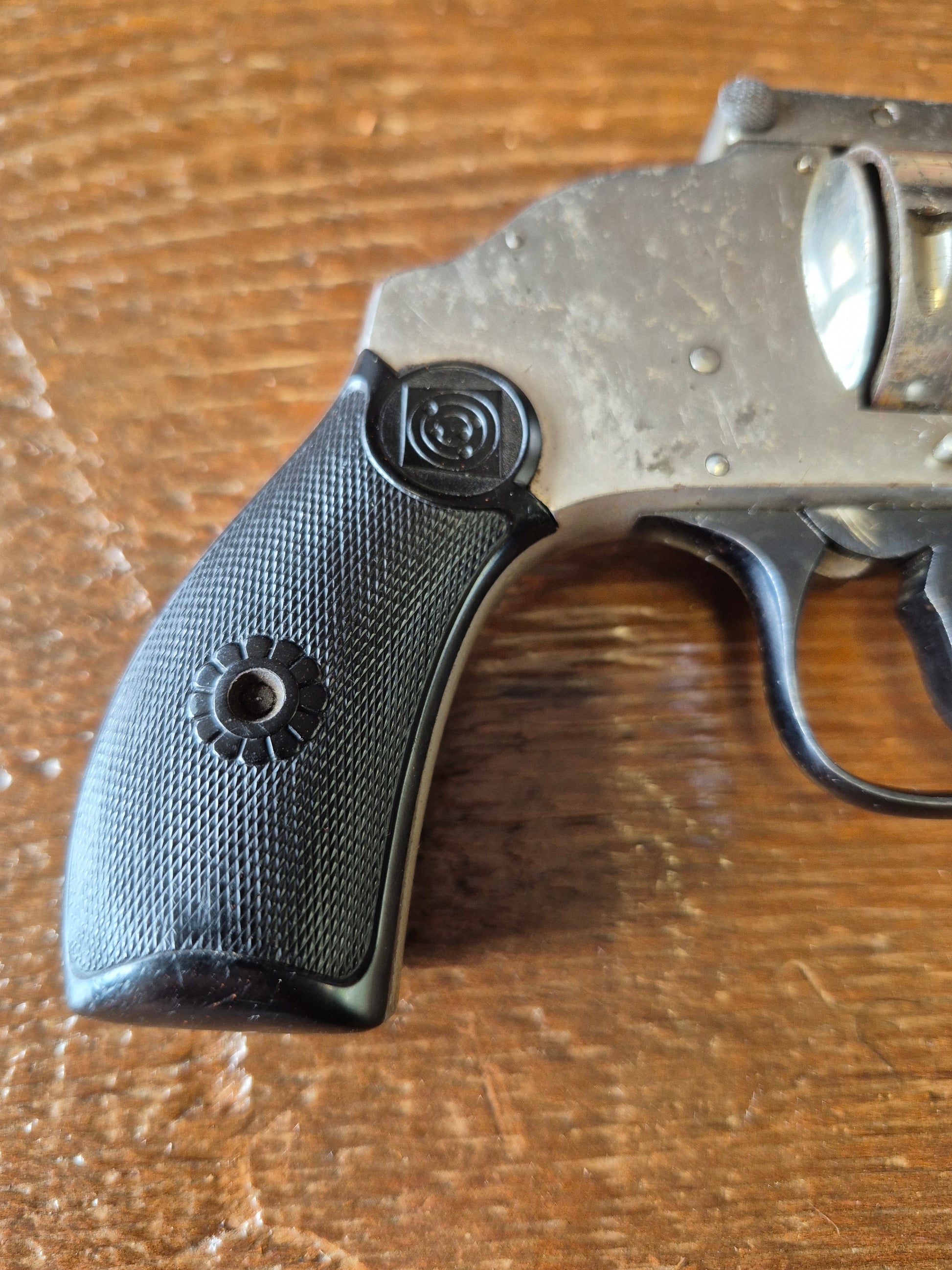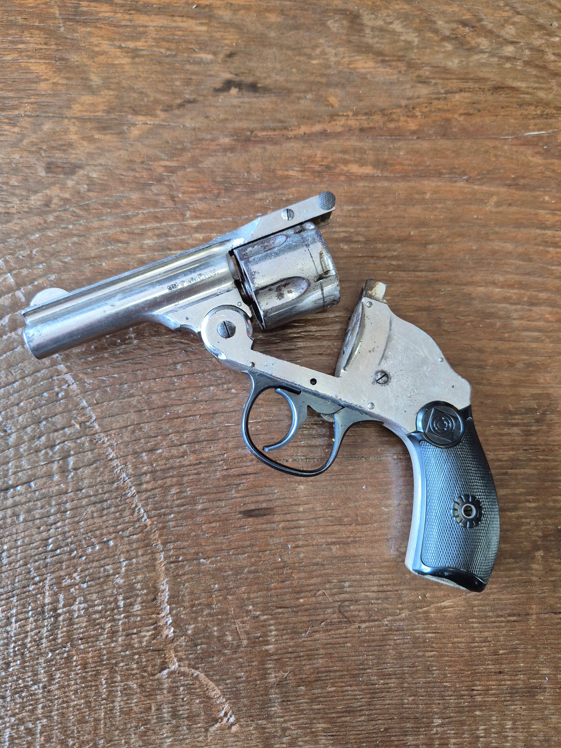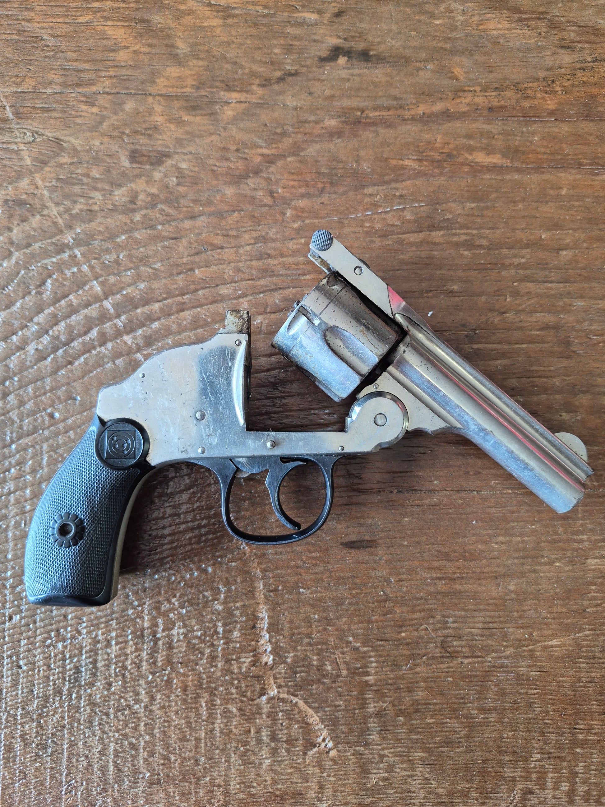 Very nice condition H&R 32 s&w top break hammerless revolver. Good nickle finish and functions as it should.