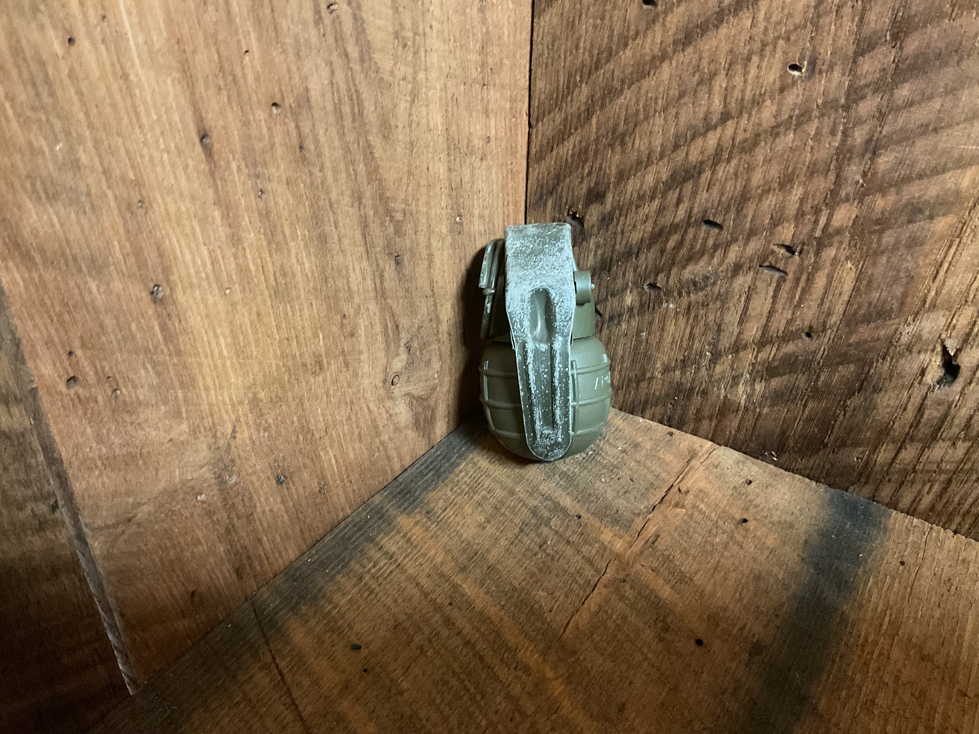 The SPL HGR 86 mini-frag offensive Grenade is plastic bodied and contains steel balls wrapped around a HE core. This example is totally Inert and DE-Milled.
