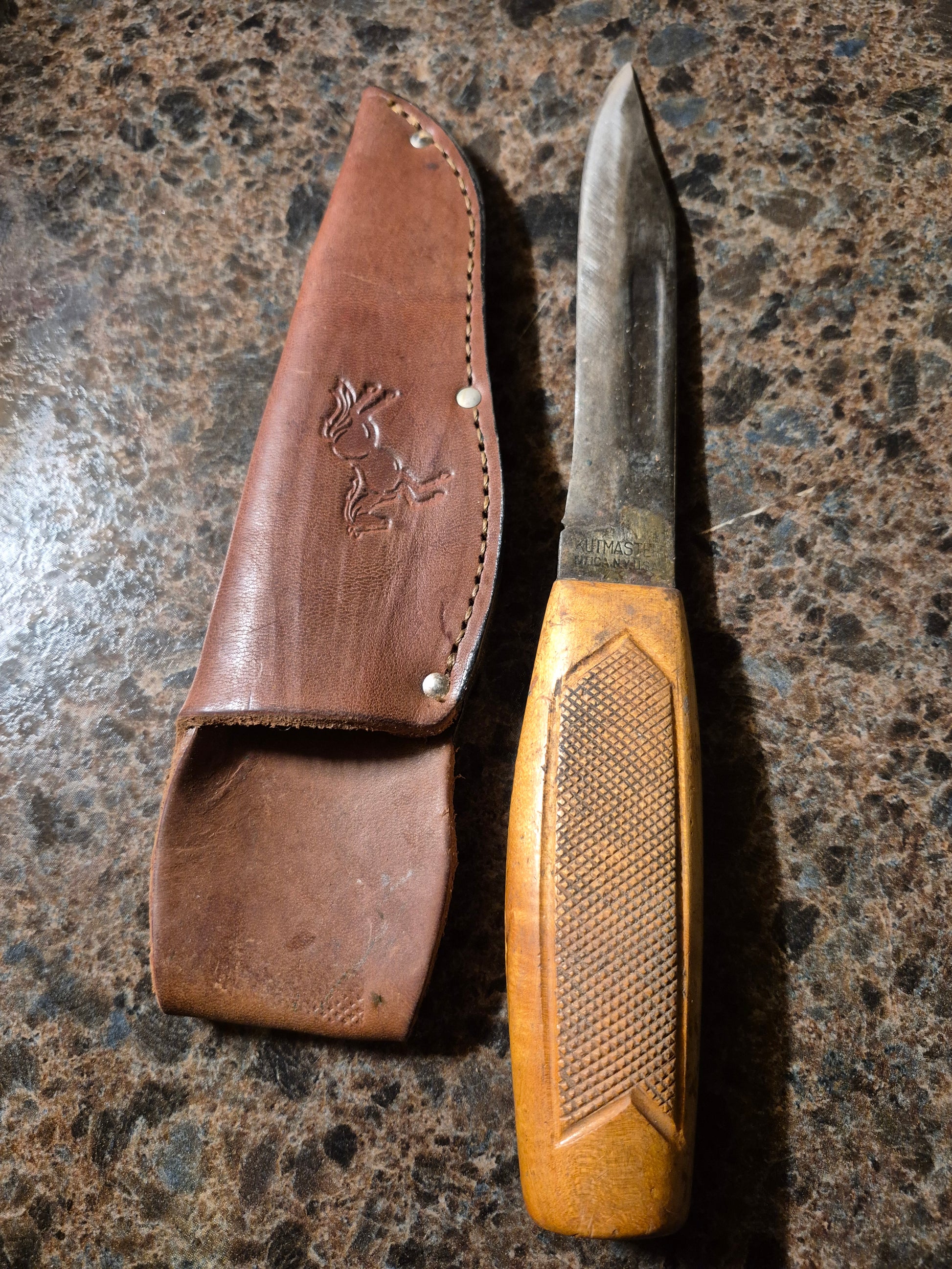 WW2 Kutmaster fighting knife with a theater re-handle and post war sheath.