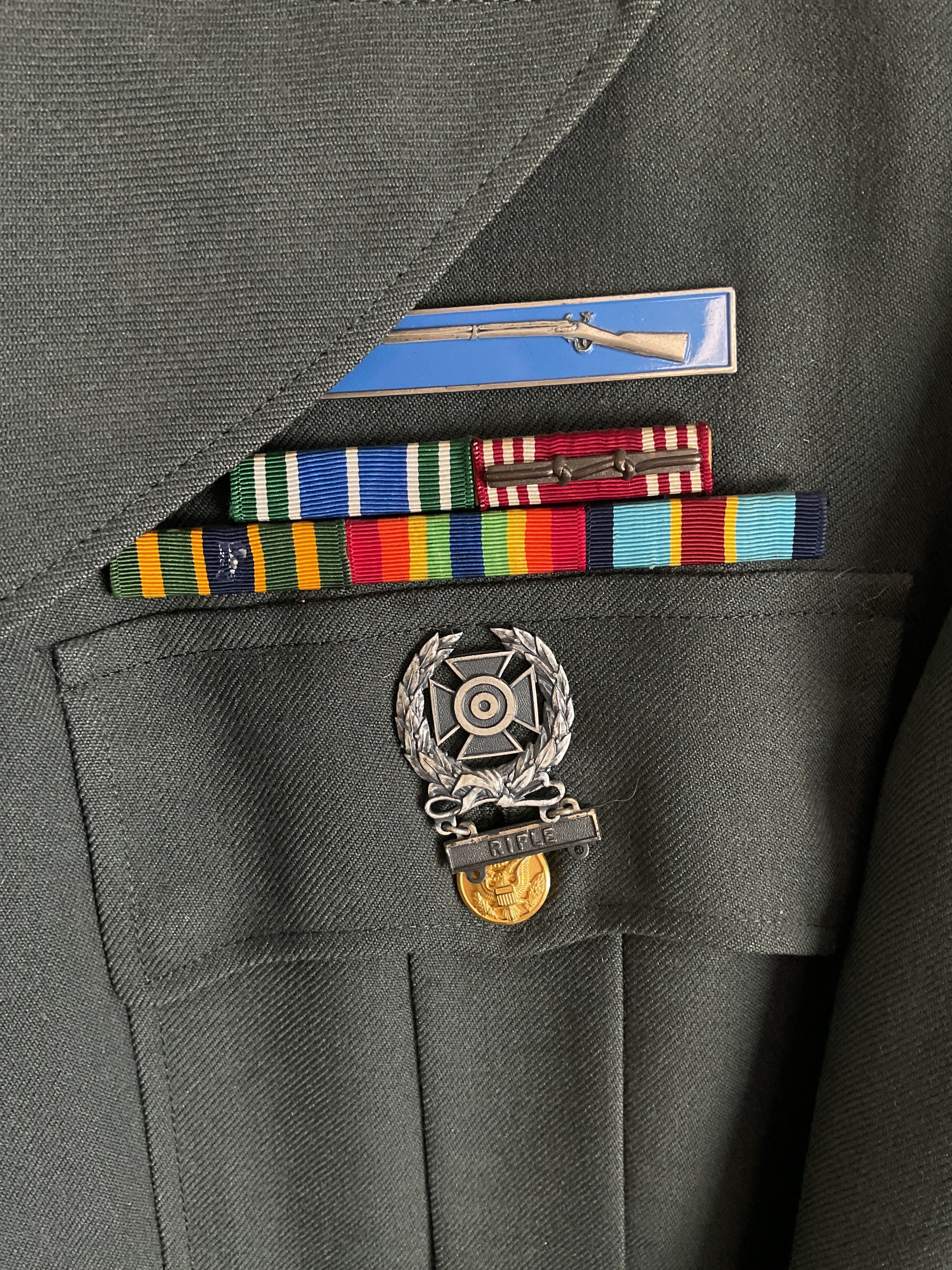 For sale is an authentic Korean War-era U.S. Army Dress Green Uniform set, consisting of an Army Green Service Uniform (AGSU) jacket and matching trousers, belonging to a Staff Sergeant assigned to the U.S. Army Infantry School. This dark green polyester-wool jacket features the Infantry School patch on the right shoulder—a blue shield with a white sword and the motto “Follow Me”—along with Infantry branch insignia (crossed rifles) on the collar. The sleeves display three chevrons with two rockers, indicating the rank of Staff Sergeant, from the early 1950s, a period following the Korean War (1950–1953). The jacket includes a ceremonial aiguillette, suggesting a formal role such as an instructor or honor guard at Fort Benning, and a robust ribbon set: National Defense Service Medal, Korean Service Medal, United Nations Service Medal, Army Good Conduct Medal, and Army Commendation Medal. A Marksmanship Badge with a “Rifle” clasp indicates qualification as a marksman.
