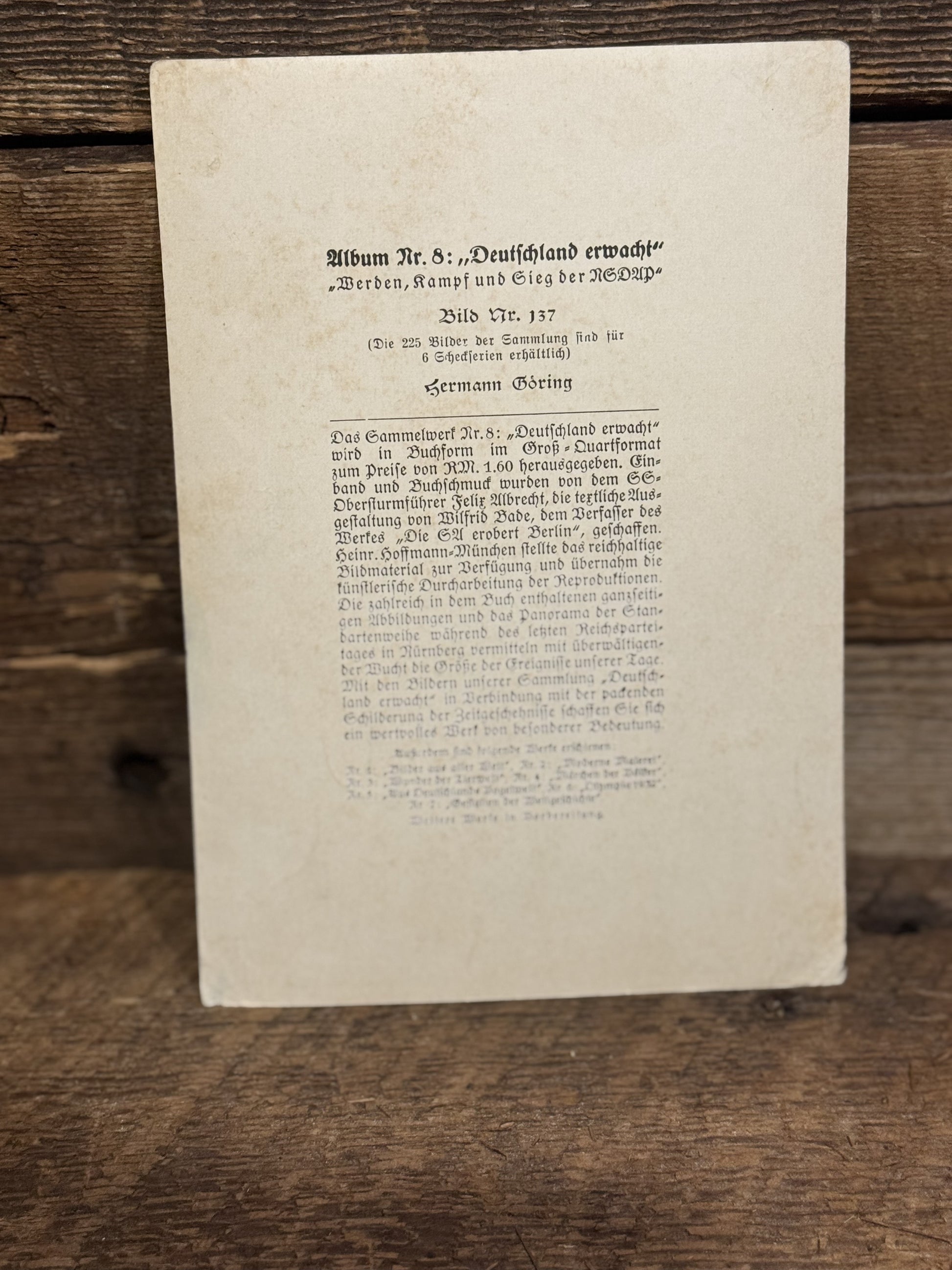 WWII-era German tobacco propaganda card featuring Hermann Göring on the front. This striking collectible offers a glimpse into the propaganda techniques of the time, showcasing Göring, a prominent figure in Nazi Germany. The card is not only a unique conversation starter but also an intriguing artifact for collectors of military memorabilia and World War II history. Don’t miss your chance to own a tangible piece of the past!