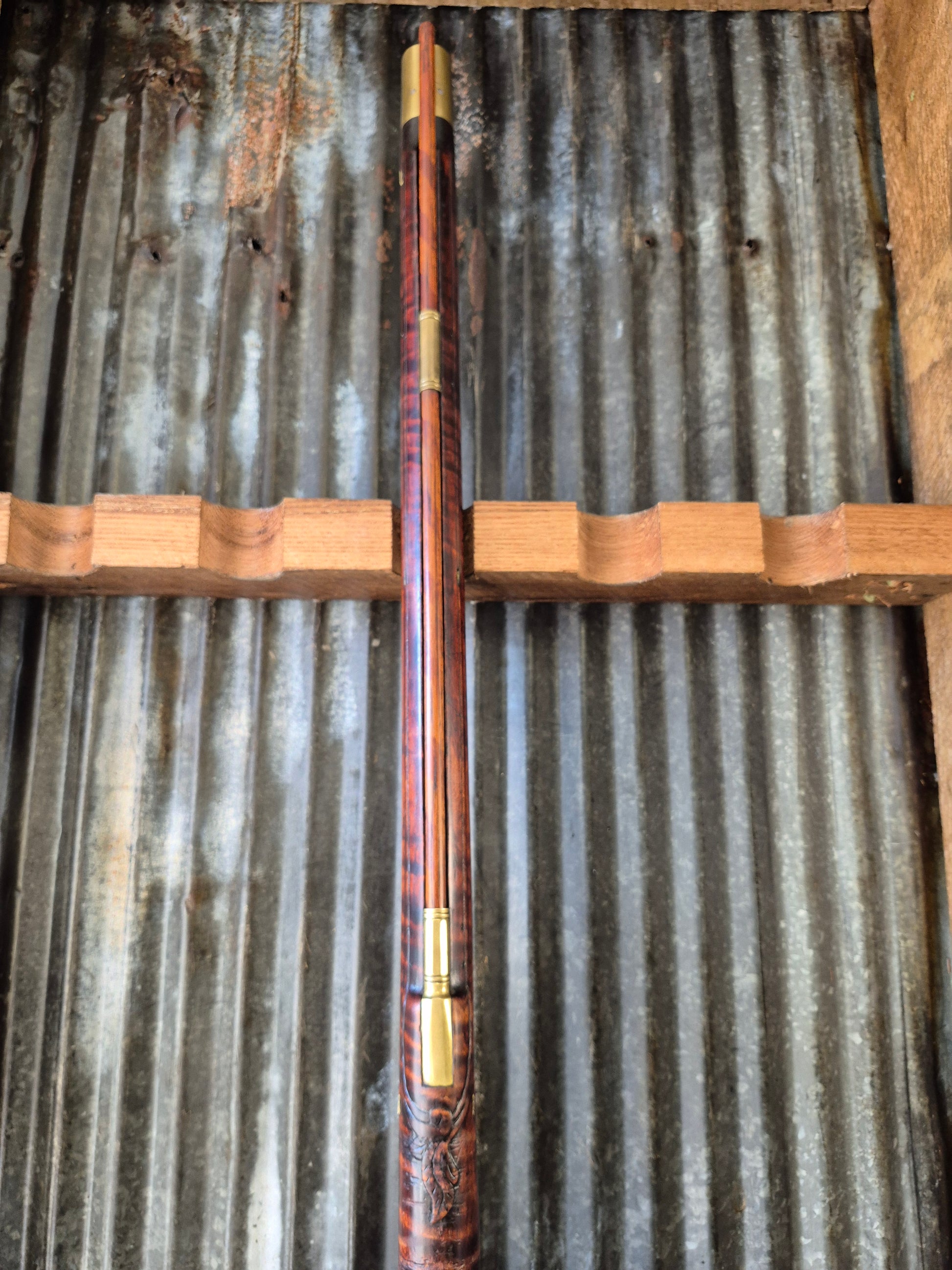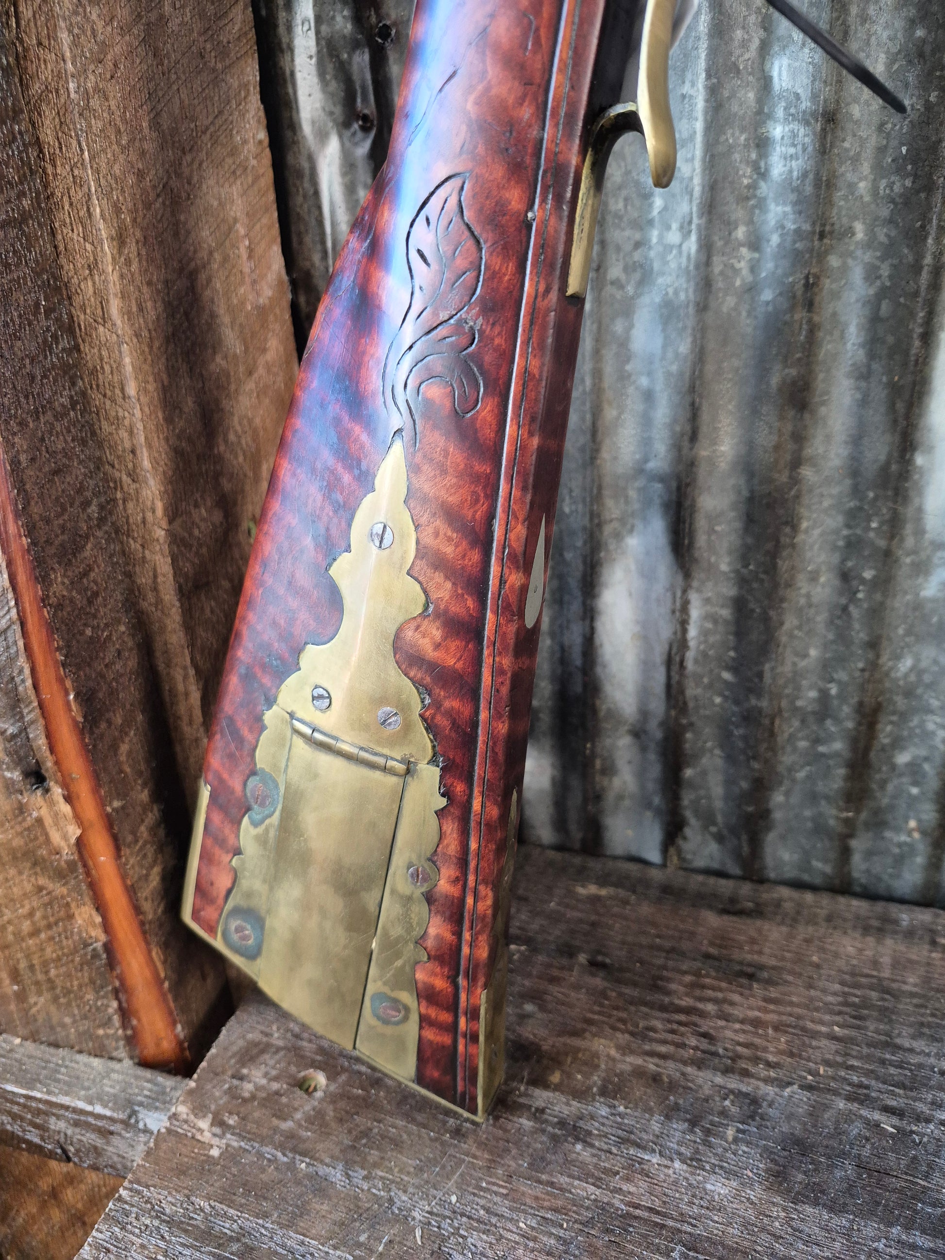 Brass buttplate, trigger guard, and ramrod pipes. Patchbox on the right side for storing cleaning supplies.