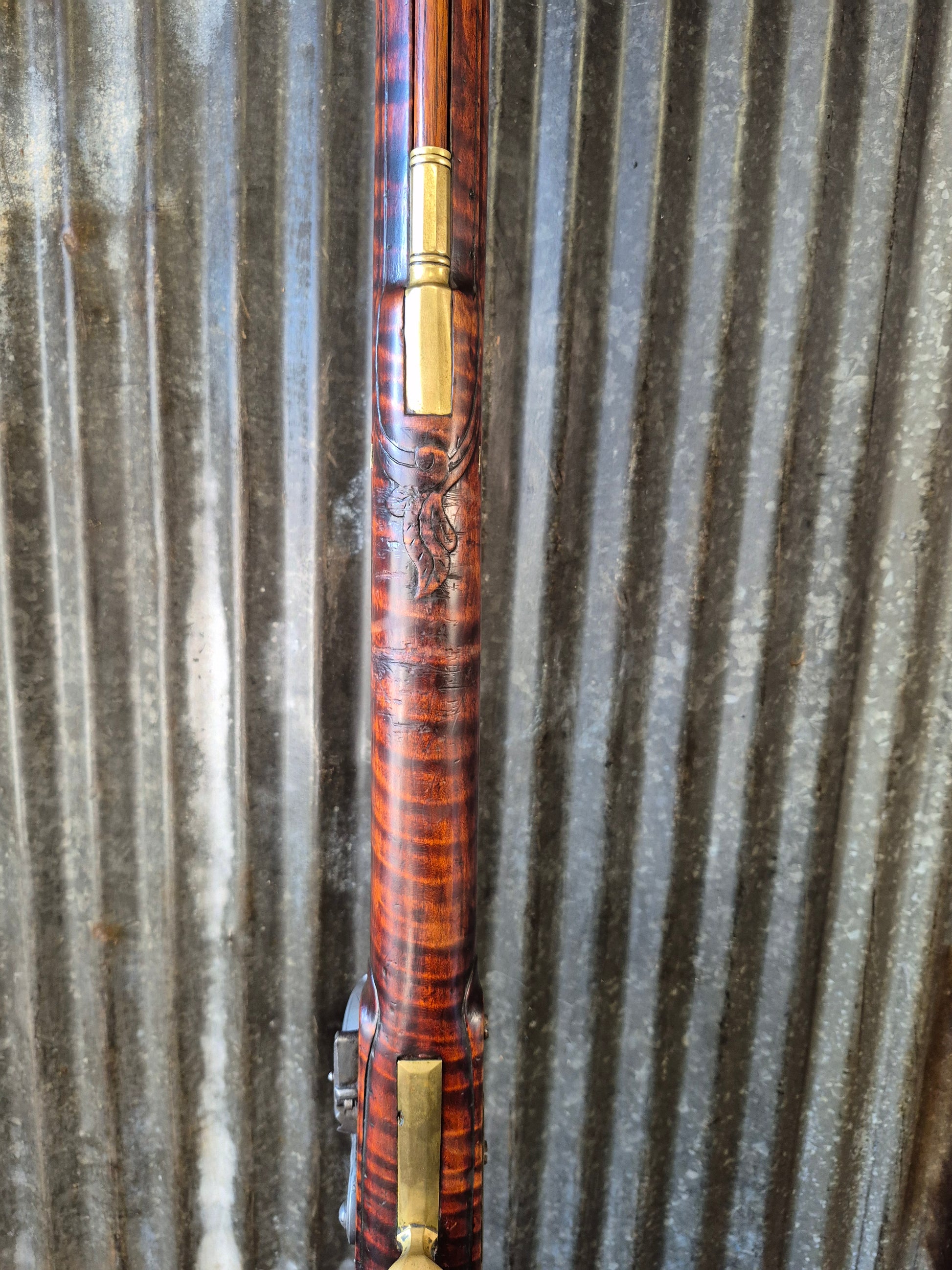 Full-length curly or tiger maple, often darkened with oil finish. Checkered forearm and wrist for grip; brass or silver inlays (e.g., thumbplates, sideplates).