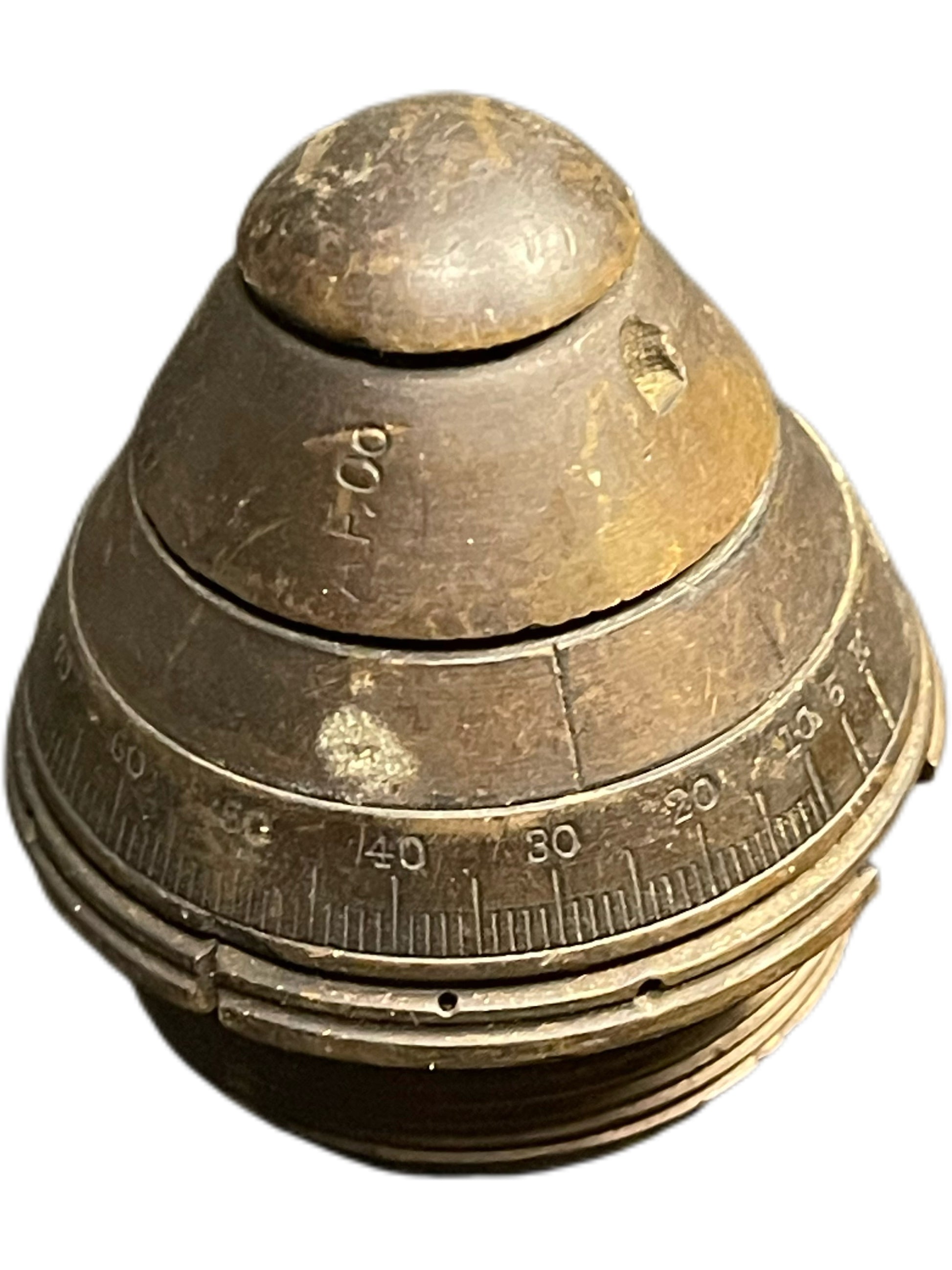 • Condition: The fuze exhibits signs of age, including surface rust, discoloration, and minor pitting, adding to its authentic character. It has a threaded base for attachment to a shell, with visible setting holes for a fuze setter tool.