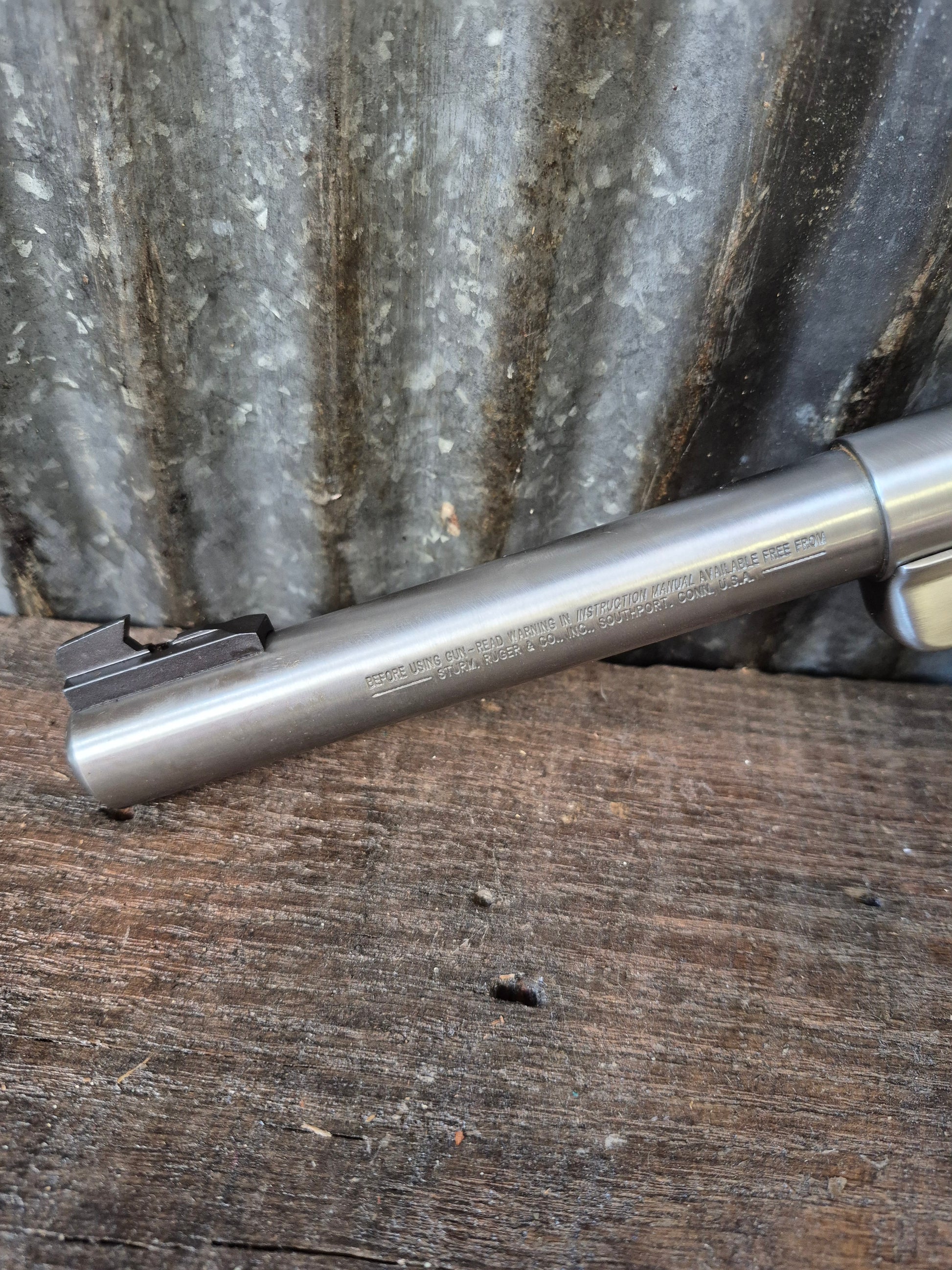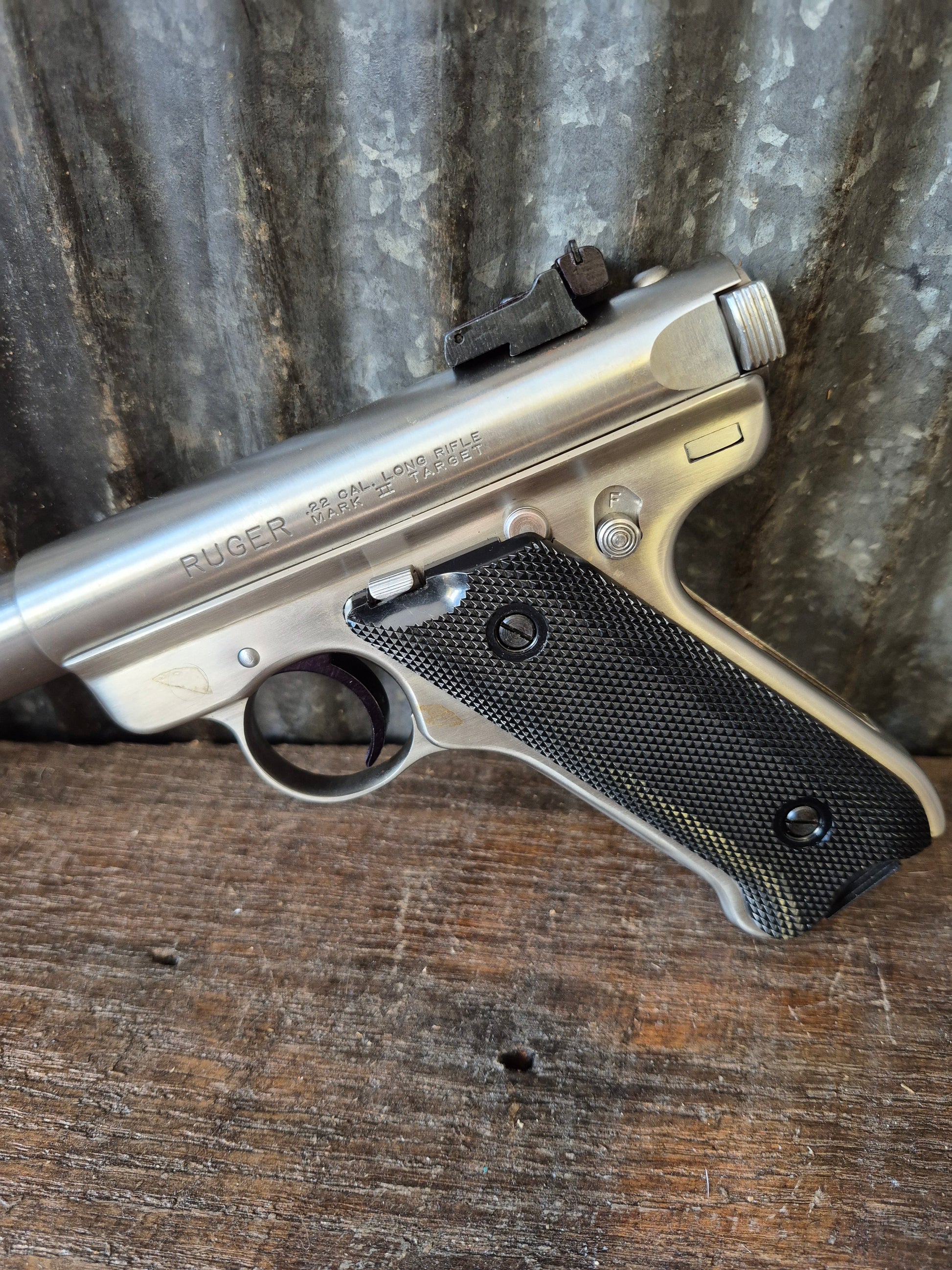 The Ruger Mark II Government Target Model in stainless steel (often abbreviated as KMK678G) is a discontinued variant of the iconic Ruger Mark II semi-automatic pistol, chambered exclusively in .22 Long Rifle (.22 LR). Introduced in the early 1980s, it was specifically designed to meet U.S. military specifications for .22 caliber target shooting and training pistols. Ruger secured a contract with the U.S. Army's Rock Island Arsenal in 1983, leading to the development of this model with enhanced accuracy features. Production continued until the Mark II line ended in 2004, after which it was succeeded by the Mark III series. The stainless version is particularly prized for its corrosion resistance and aesthetic appeal, though it can develop minor pitting if not properly maintained.