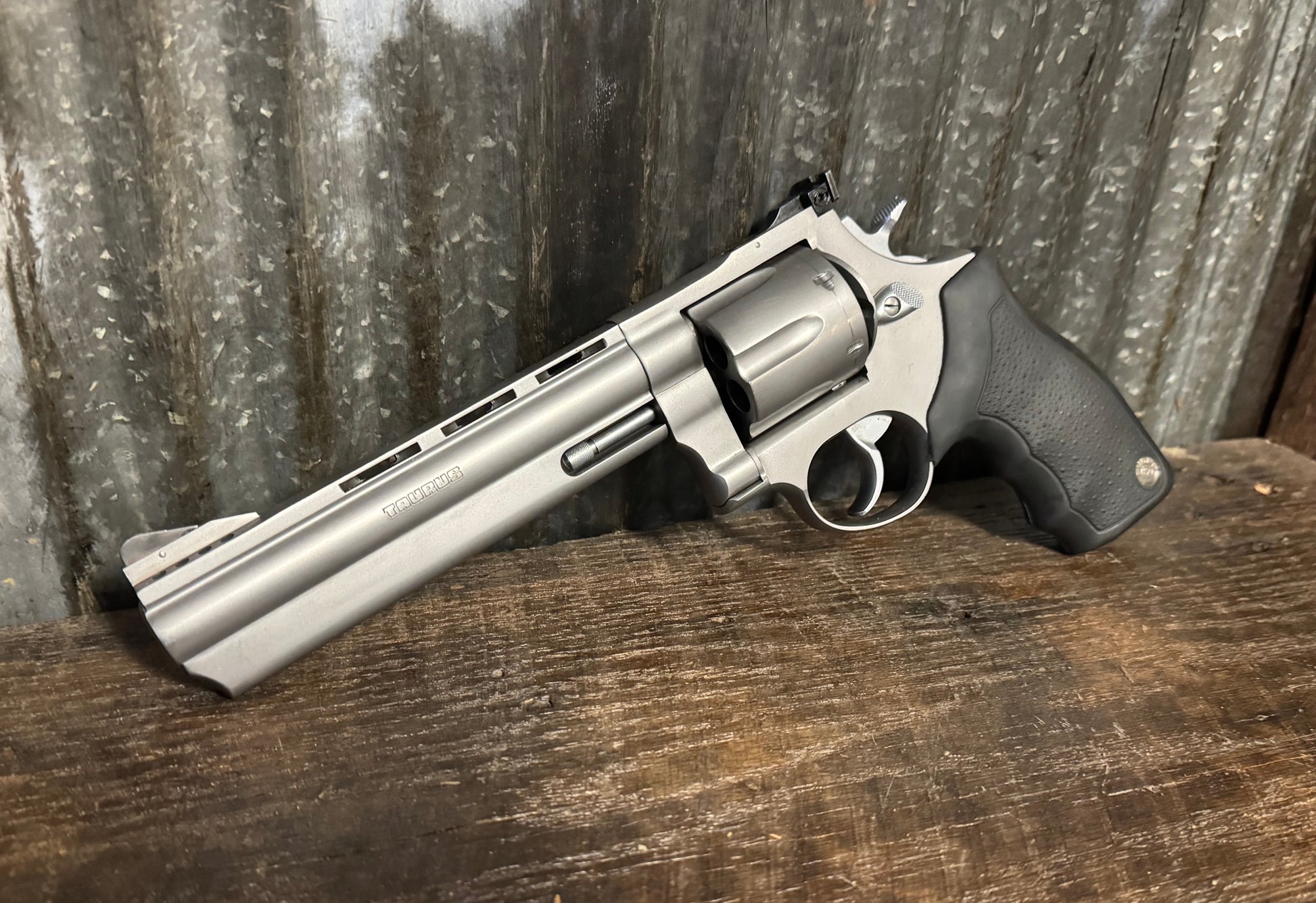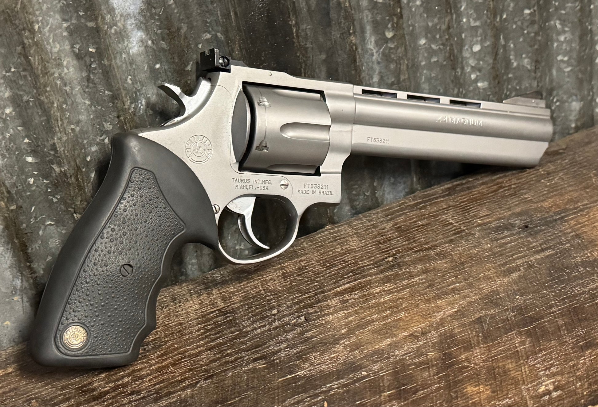 Stainless, 8⅜” vent-rib barrel, adjustable sights, rubber grips.