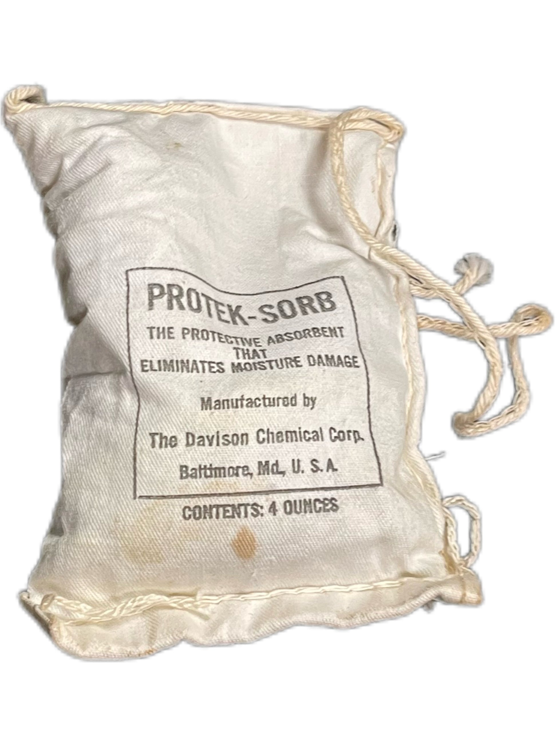 • A PROTEK-SORB desiccant bag (4 oz, manufactured by The Davison Chemical Corp.), included to prevent moisture damage during storage—an uncommon accessory that adds to the set’s originality.