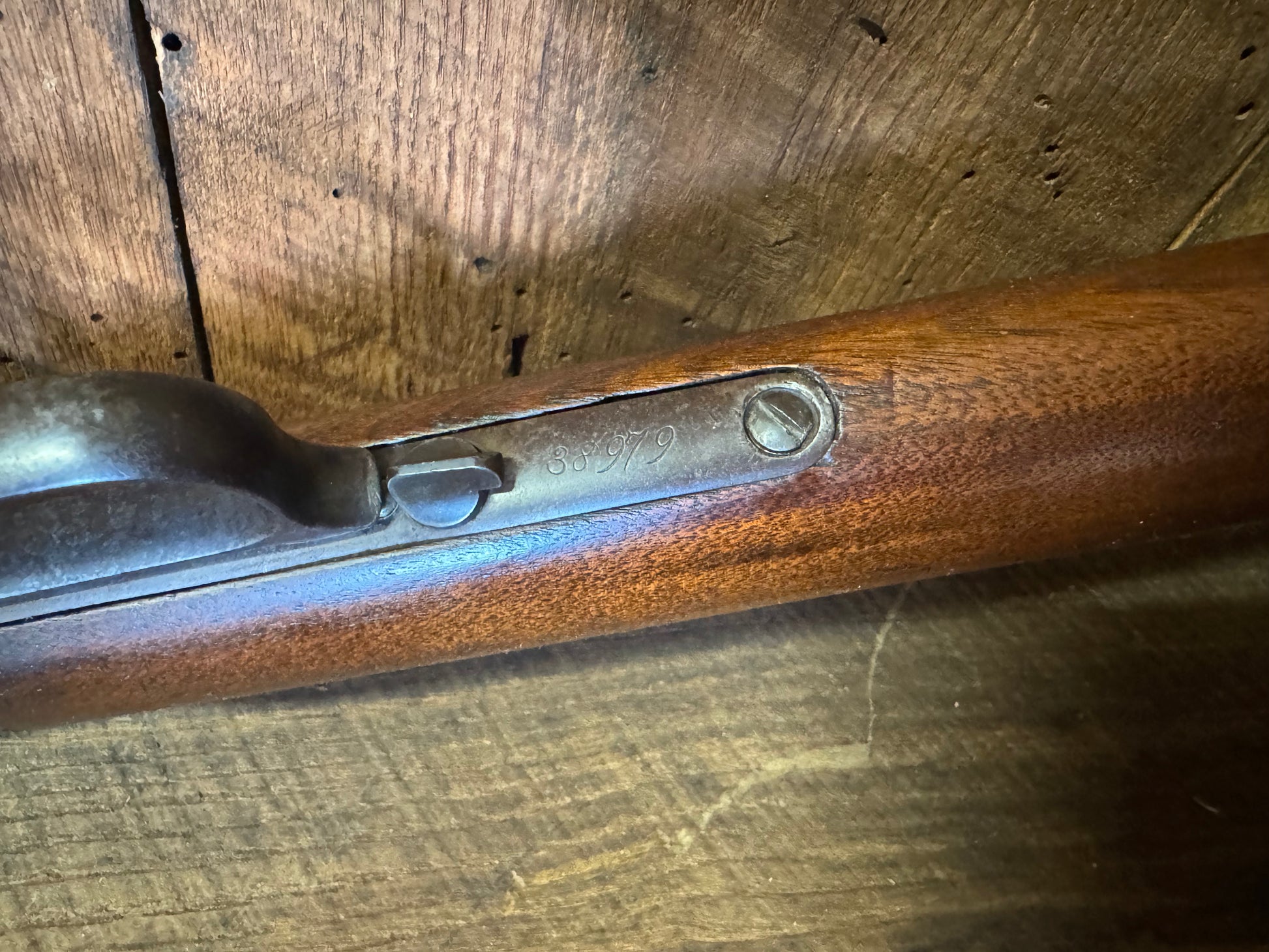 Dust cover is replacement from later second model. Brass elevator correctly unmarked as all 1st and early second models were chambered for 44 caliber.