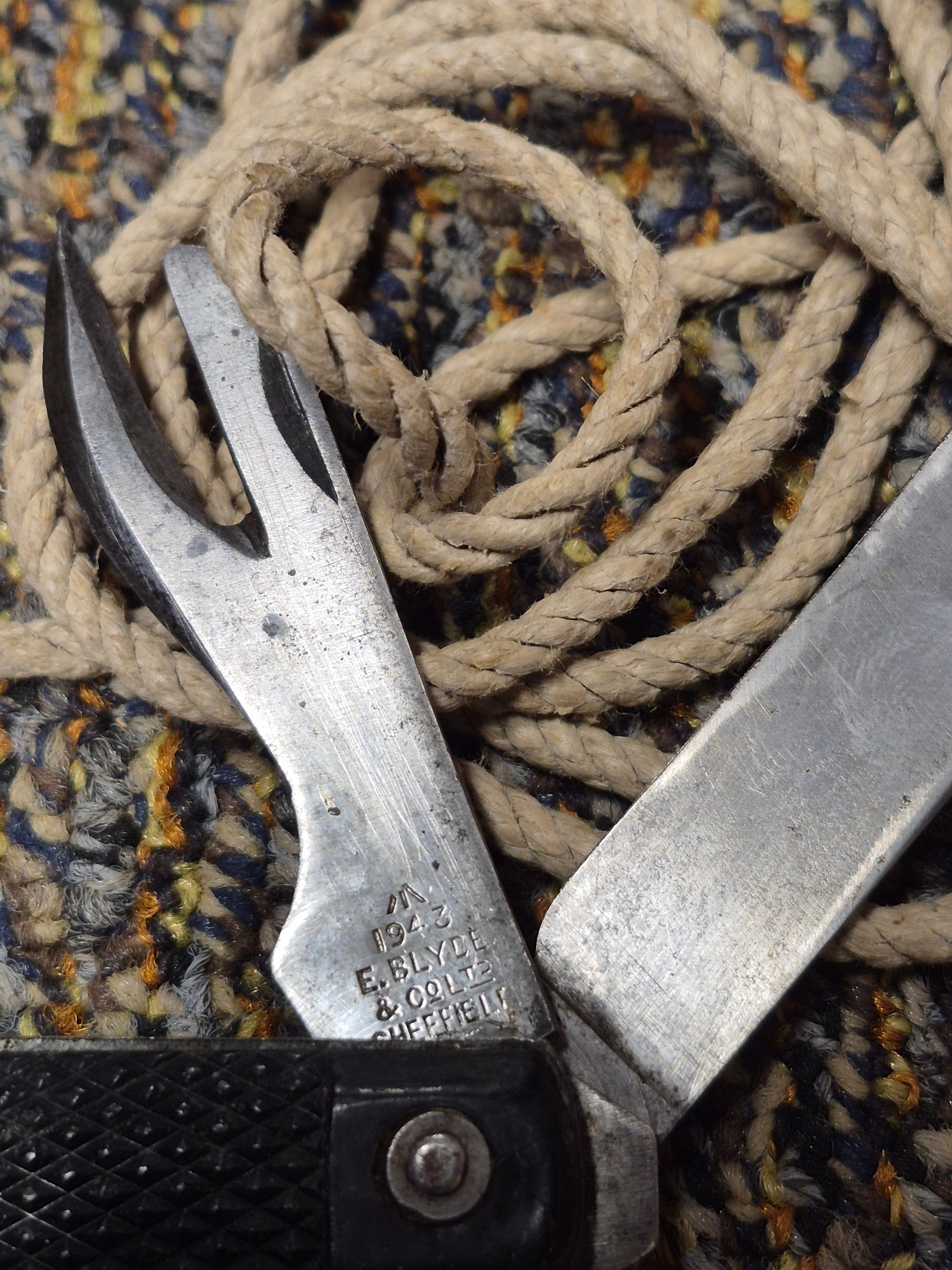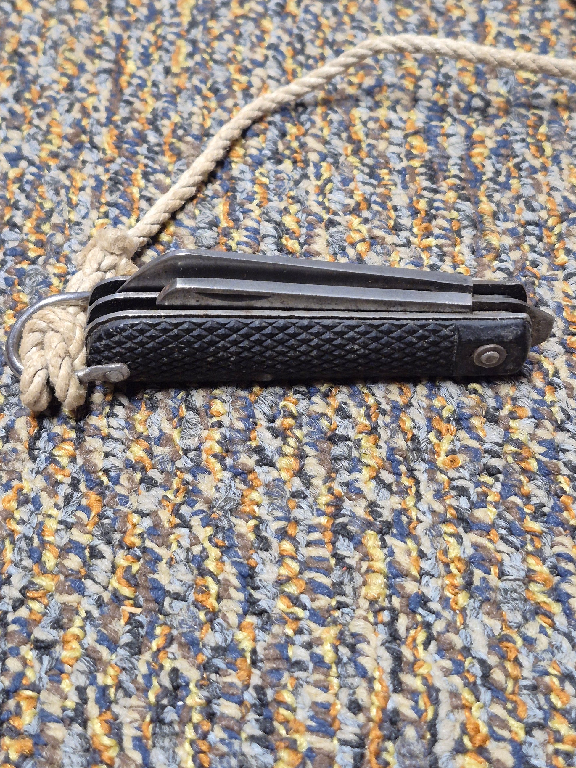 Excellent condition British issue pocket knife with a cutting blade and a can opener blade, WW2 issue with the lanyard.