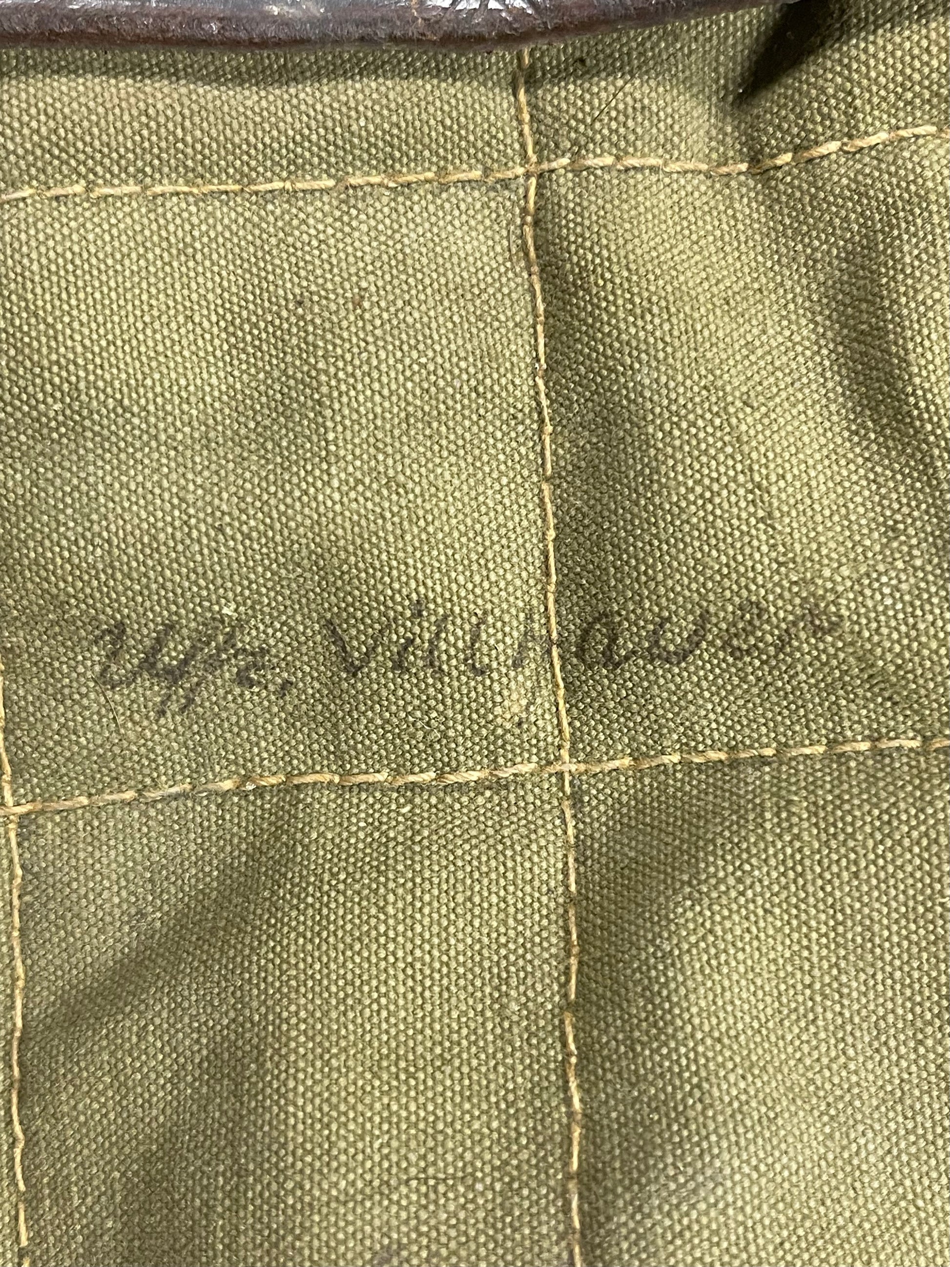 • Markings: Stamped on the leather with “E.G. Leuner Bautzen 1940,” confirming its production by the well-known manufacturer E.G. Leuner in Bautzen, Germany, during the early stages of WW2. Additionally, a handwritten inscription on the canvas reads “Wfr. Villhauer,” likely the name of the soldier to whom it was issued (possibly a quartermaster or armorer), adding a personal historical connection.