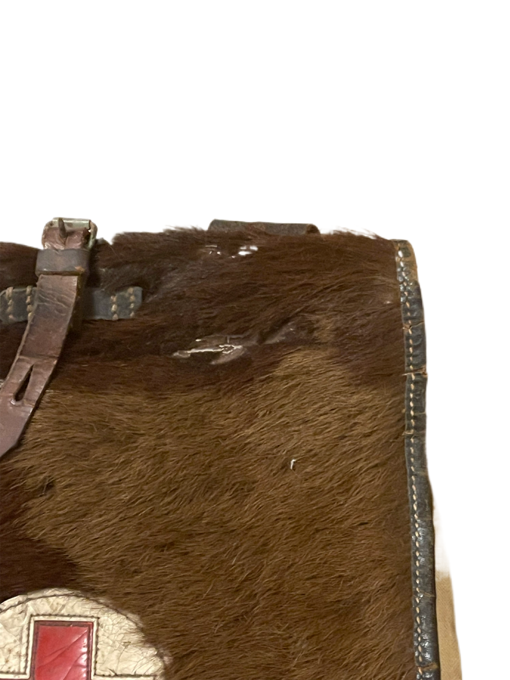 • Condition: This medical Tornister is in field-used condition, reflecting its historical use. The canvas body shows staining and fraying, the fur flap is patchy, and the leather straps and metal hardware exhibit wear with some rust. The red cross symbol is faded but legible, with cracking on the white background, adding to its authentic, battle-worn character.