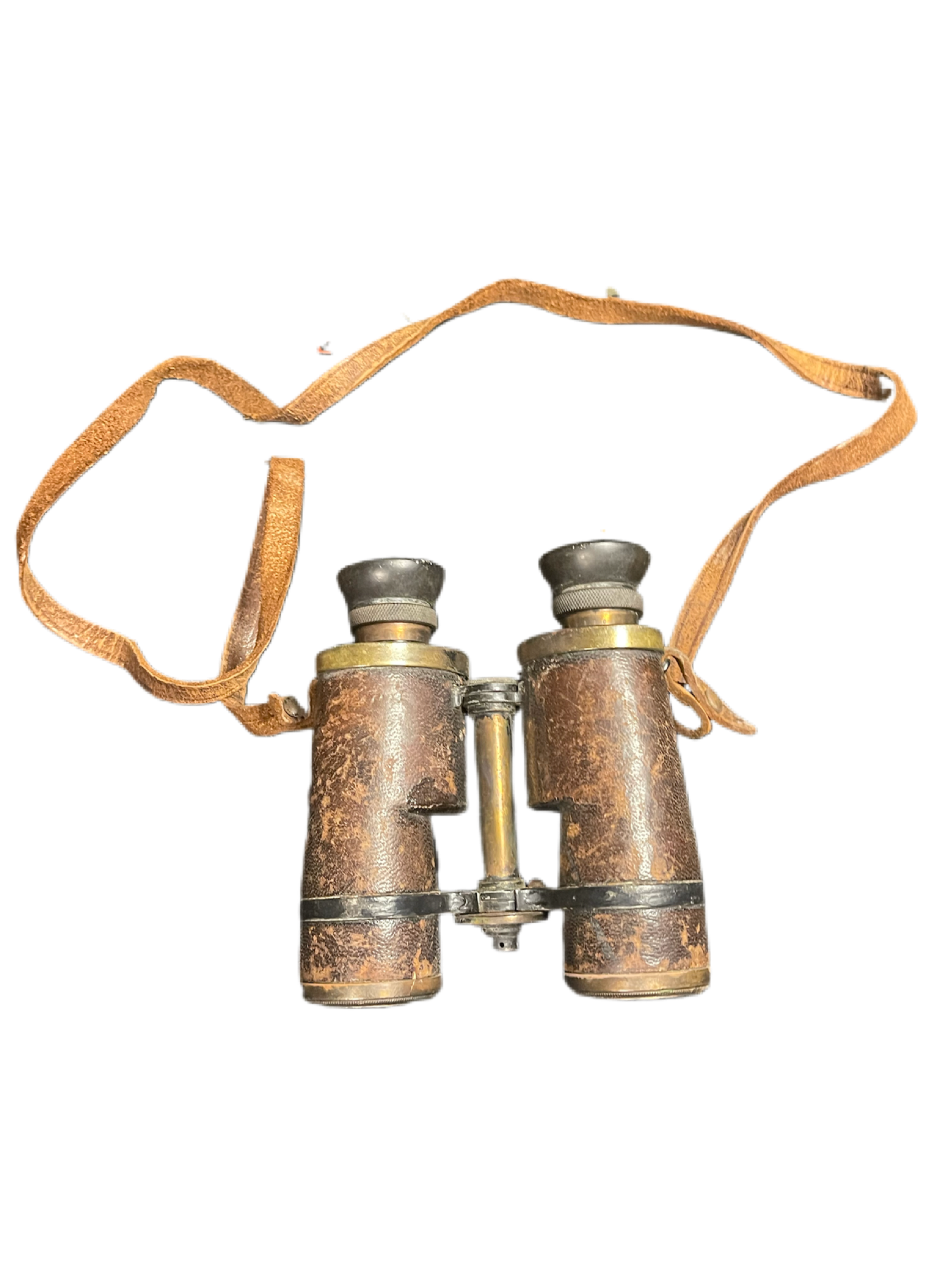 The binoculars feature a classic porro-prism design with 6x magnification and 30mm objective lenses, ideal for reconnaissance, artillery spotting, or navigation—key tasks for officers during WWI. Constructed from brass with a leather covering, they exhibit a beautiful patina and wear consistent with over a century of history, adding to their authentic wartime character.