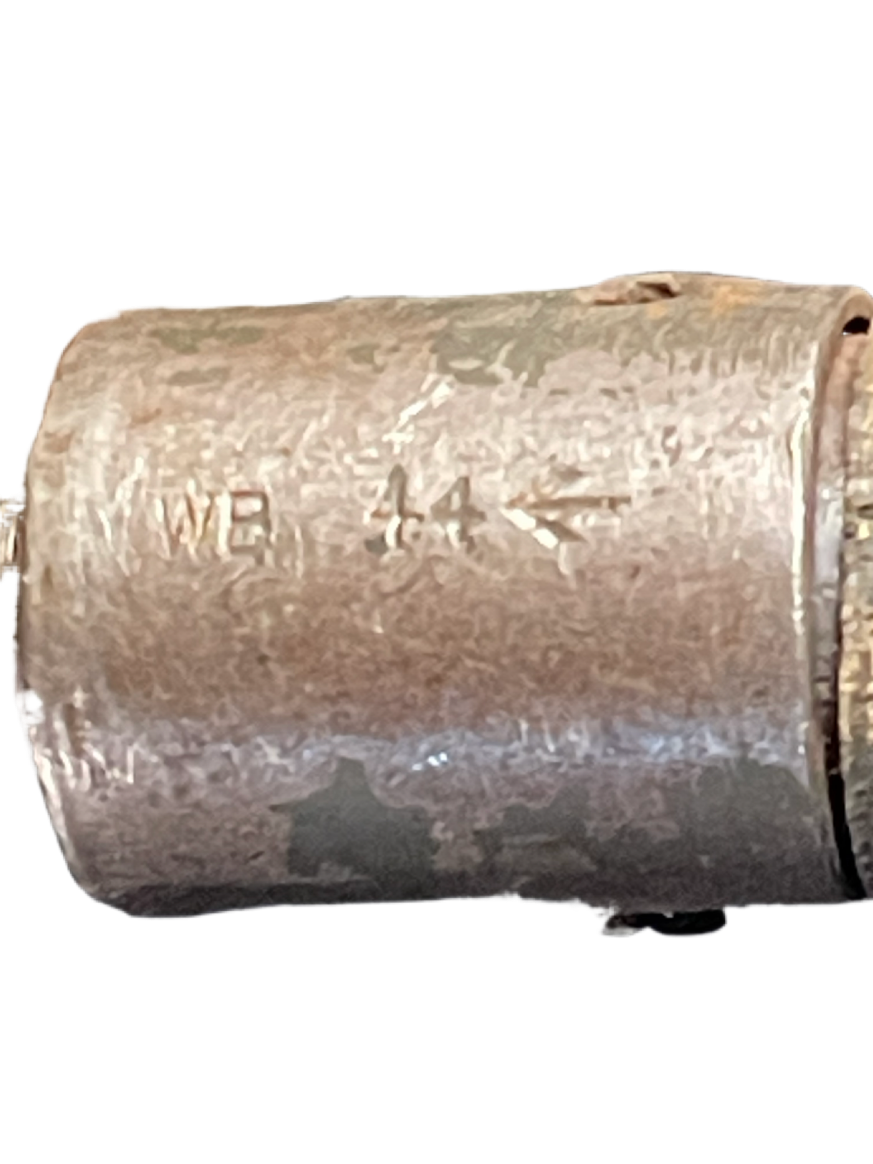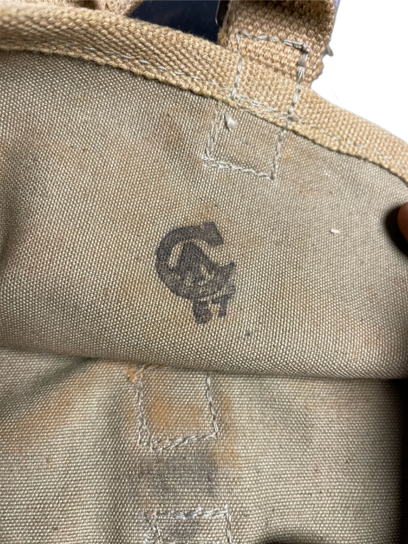 Step back into WWII history with this authentic British Pattern 1937 entrenching tool, dated 1941. This complete set includes the cast iron head, clearly stamped “1941,” a wooden handle (helve), and its original canvas carrier. The head is a classic Pattern 1908 design, reintroduced in 1941, featuring a pointed blade with a circular aperture, allowing it to function as both a spade and a pick mattock. The wooden handle, marked “W.E. 41,” aligns with the head’s production year, indicating it was manufactured during the early years of the war. The canvas carrier, part of the 1937 Pattern webbing system, bears a “G” over “H” marking—likely a manufacturer’s or military acceptance stamp—and shows signs of field use with visible wear. The blade exhibits rust and the canvas is weathered, reflecting its authentic wartime use by British or Commonwealth soldiers. A versatile tool for digging trenches, foxholes, or latrines, this entrenching tool is a must-have for collectors of British WWII militaria, offering a tangible connection to the soldiers who relied on it in the field.