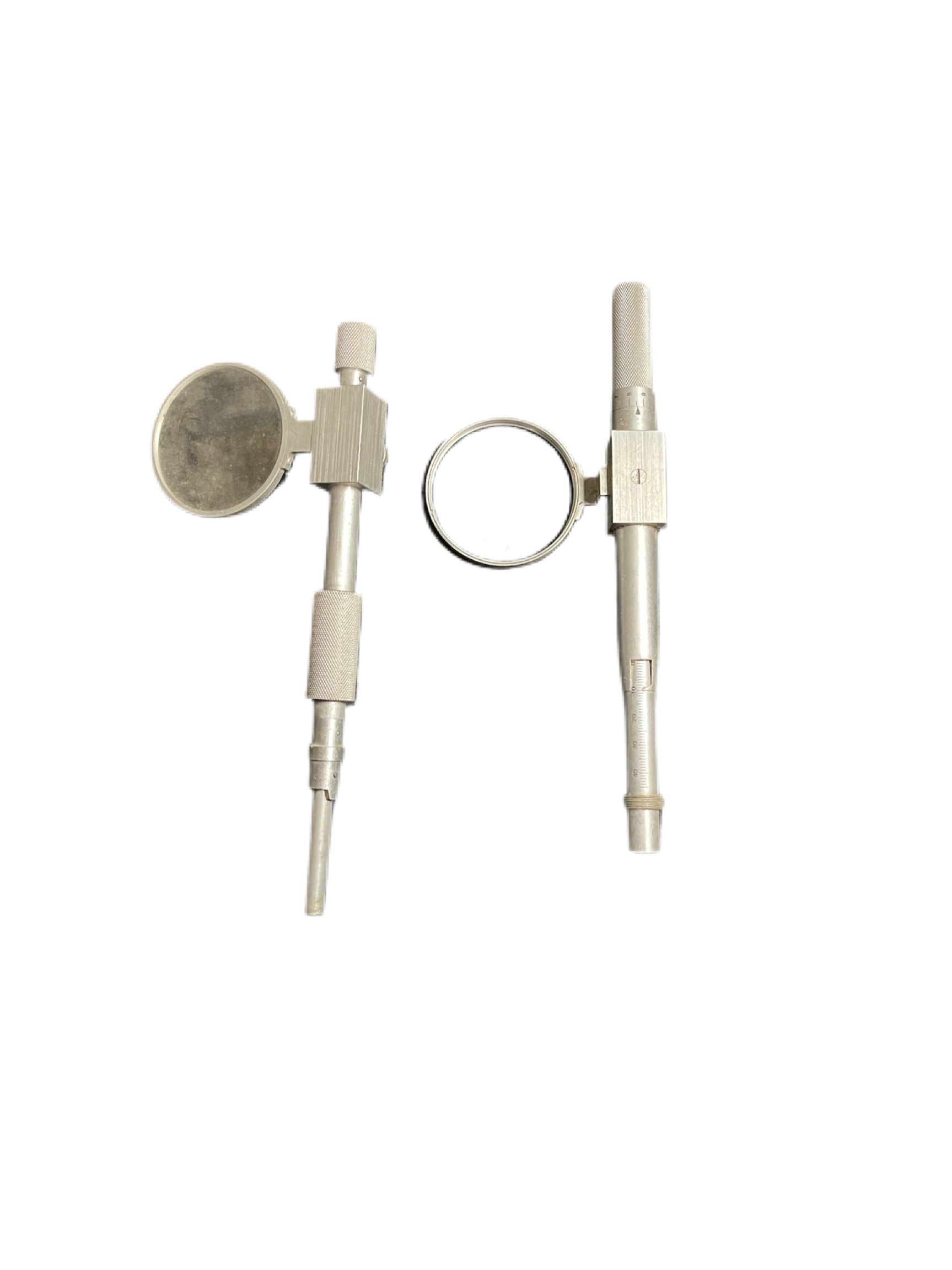 - Two precision parallax measurement arms (silver, with knurled handles and scales for accurate adjustments).