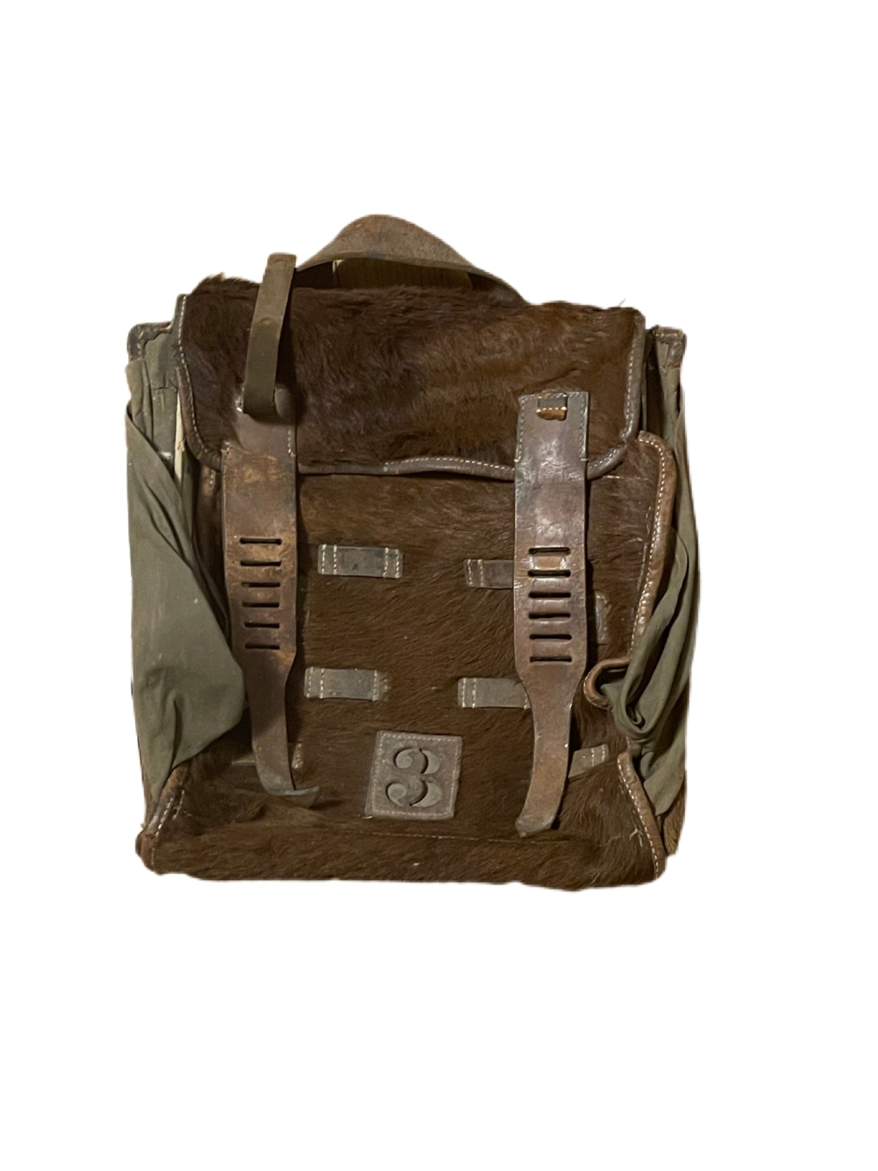Crafted with a combination of durable olive drab canvas and rich brown cowhide with fur backing, this backpack showcases the rugged craftsmanship of wartime Germany. The fur panel, a hallmark of Tornister design, provided ventilation and comfort for soldiers during long marches, while the canvas sides ensured resilience against the elements. The bag features heavy-duty leather straps with metal buckles, complete with slots for securing additional gear, and a distinctive “33” marking on the back—likely a unit designation or inventory number, adding to its historical intrigue.