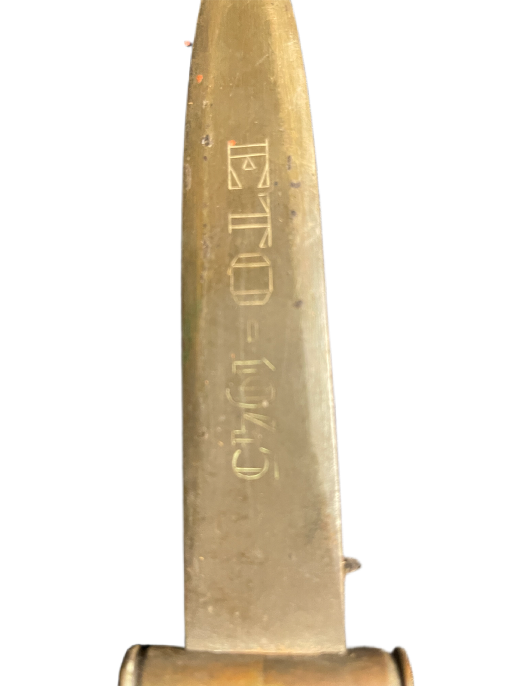 For sale is a remarkable WWII theater knife, a unique artifact from the Second World War that exemplifies a soldier’s resourcefulness and historical significance. This fixed-blade knife, likely crafted or modified by a soldier, features a 6-inch double-edged blade with a dagger-like design, perfect for both combat and utility tasks. The blade bears a hand-engraved inscription reading “ETO 1945,” referring to the European Theater of Operations in the final year of the war, providing a direct historical context. The blade shows a well-worn patina with visible scratches, reflecting its use in the field. The handle is uniquely constructed from a repurposed brass ammunition casing, with the bottom marked “DM 43,” likely indicating a German cartridge from 1943, possibly manufactured by Deutsche Metallwerke. This handle, paired with a brass guard, offers a secure grip and a striking testament to wartime ingenuity.