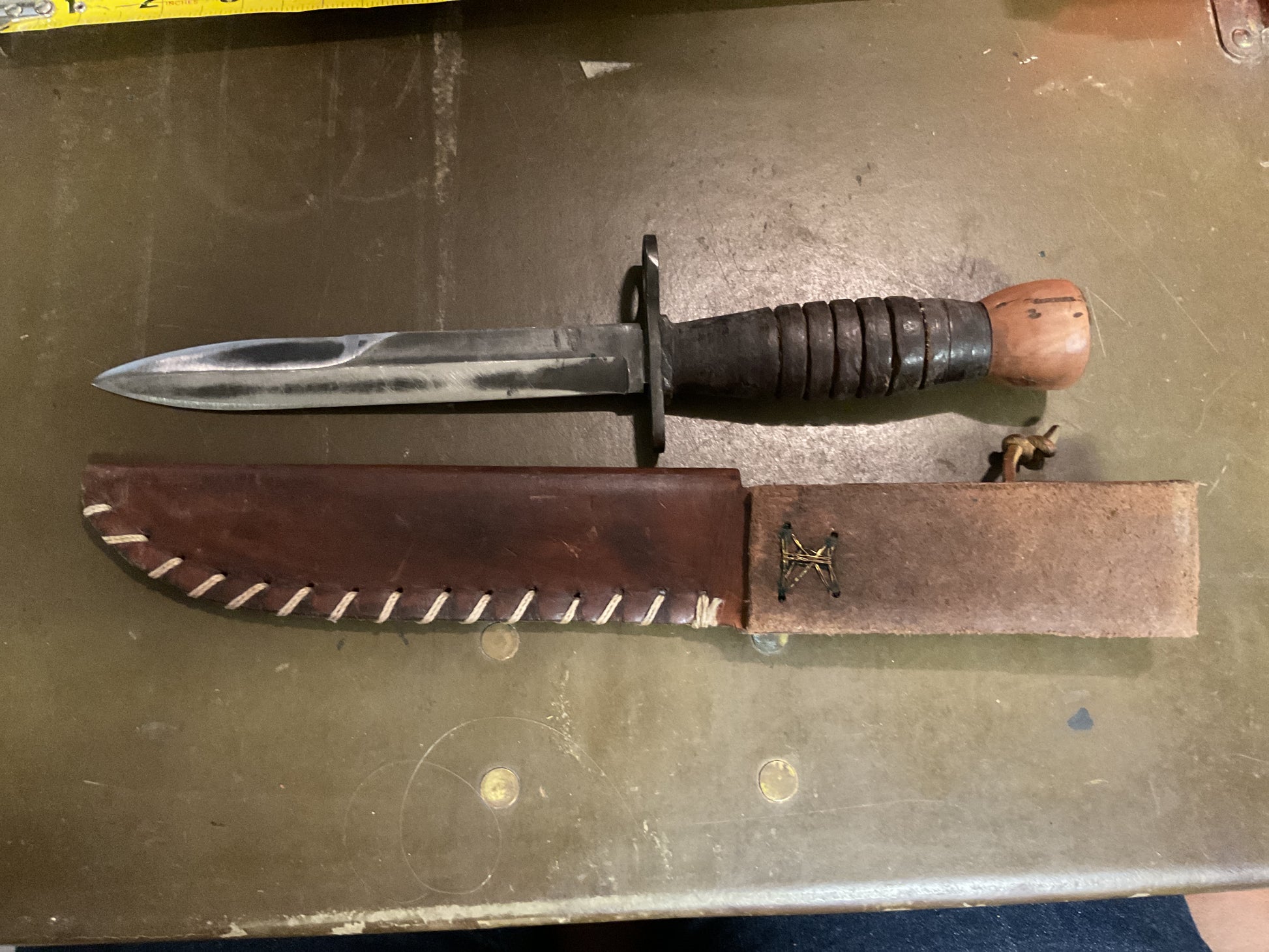 Many of these knives were further customized with artistic details—engraved initials, decorative etchings, or unique handle modifications—transforming functional military tools into personal keepsakes and expressions of creativity. This particular piece not only reflects the utilitarian history of wartime but also the personal stories and artistic spirit of the soldiers who owned them.