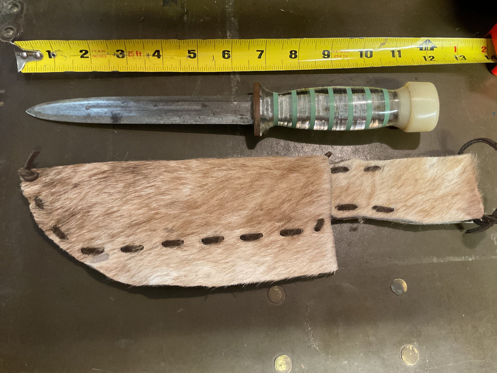 Many of these knives were further customized with artistic details—engraved initials, decorative etchings, or unique handle modifications—transforming functional military tools into personal keepsakes and expressions of creativity. This particular piece not only reflects the utilitarian history of wartime but also the personal stories and artistic spirit of the soldiers who owned them.