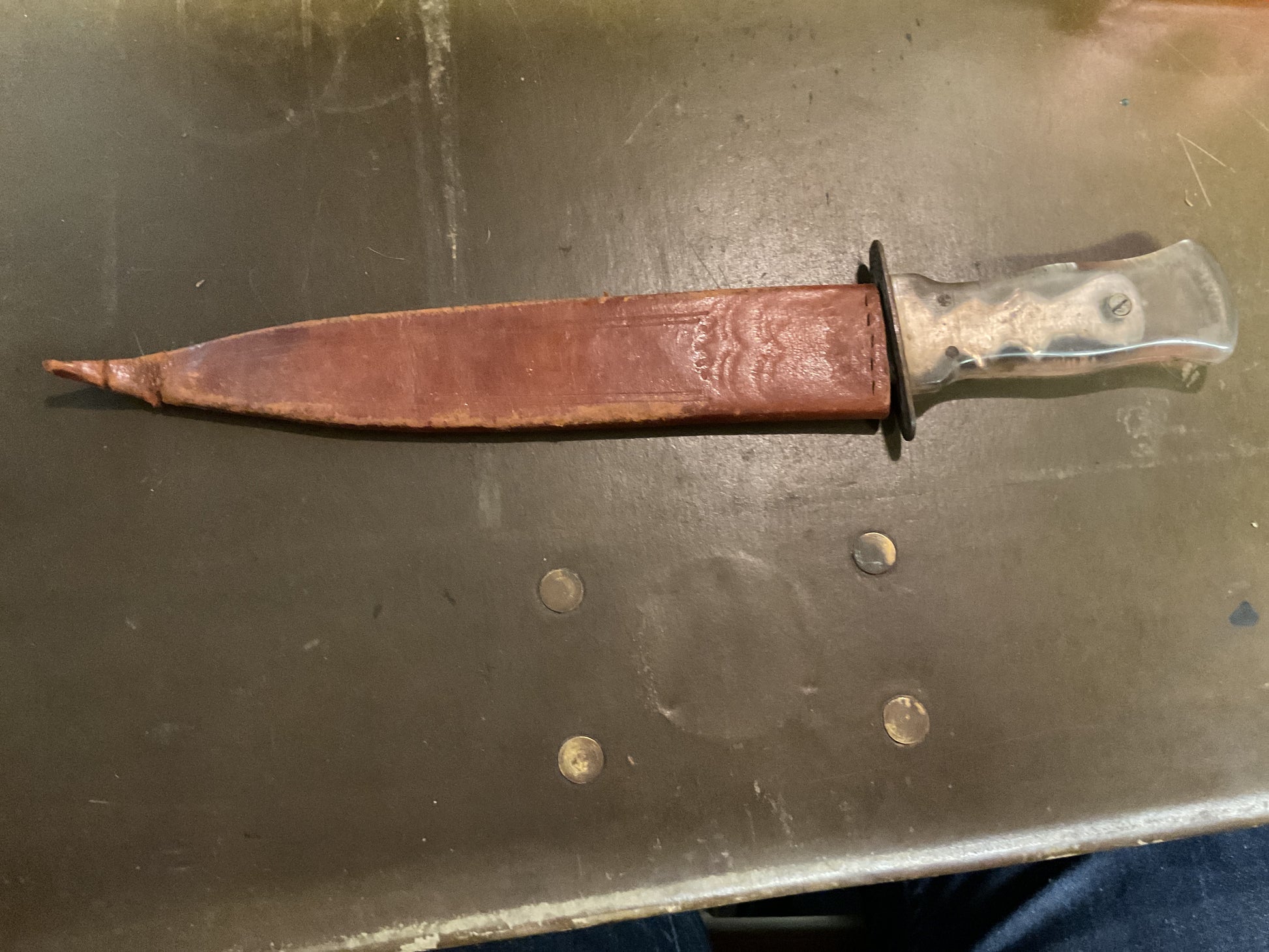 Many of these knives were further customized with artistic details—engraved initials, decorative etchings, or unique handle modifications—transforming functional military tools into personal keepsakes and expressions of creativity. This particular piece not only reflects the utilitarian history of wartime but also the personal stories and artistic spirit of the soldiers who owned them.