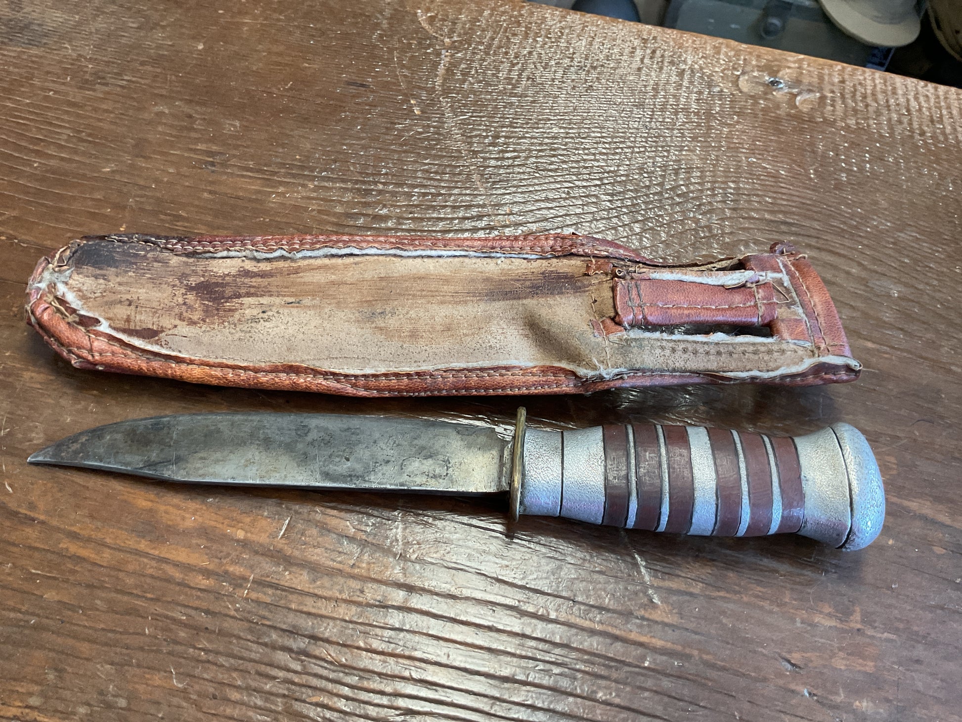 Many of these knives were further customized with artistic details—engraved initials, decorative etchings, or unique handle modifications—transforming functional military tools into personal keepsakes and expressions of creativity. This particular piece not only reflects the utilitarian history of wartime but also the personal stories and artistic spirit of the soldiers who owned them.